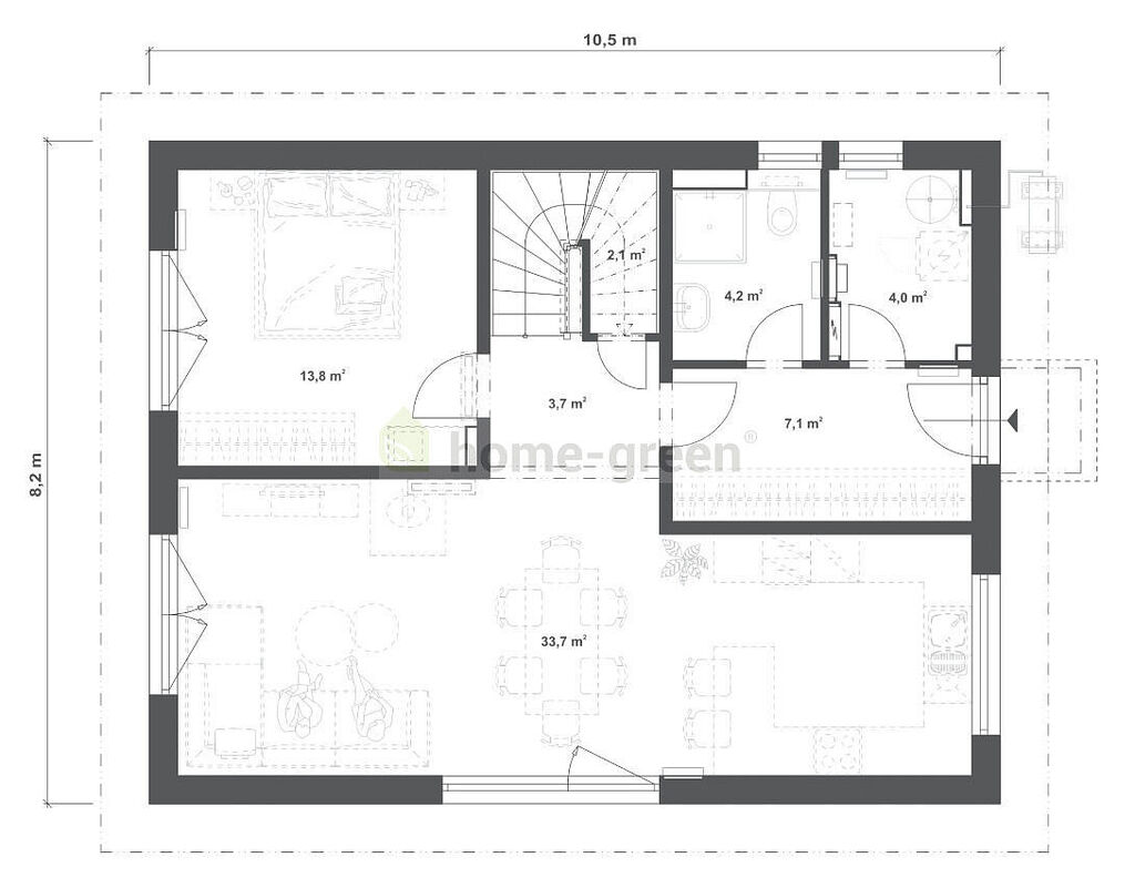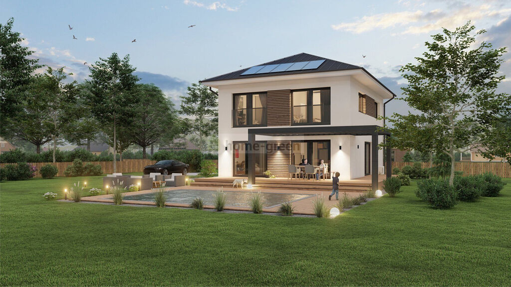 Tepelné čerpadlo je v ceně domu. Čerpadlo vzduch - vzduch v zimě dům vyhřeje, v létě zase ochladí. Fotovoltaická elektrárna je v ceně domu. Systém ON GRID s akumulací do zásobníku TUV: využívá sluneční energii pro ohřev užitkové vody v 200 litrovém zásobníku. Základová deska je v ceně domu.
