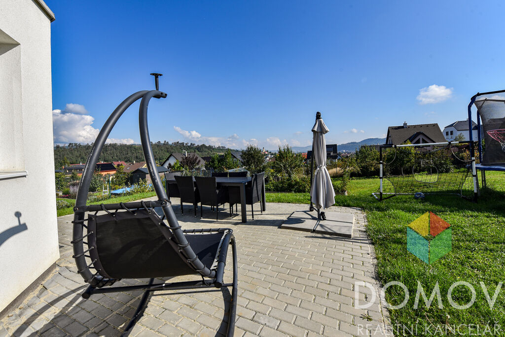 Zahrada o rozloze téměř 1000 m² nabízí dostatek prostoru pro rodinné aktivity i odpočinek. K dispozici je trampolína, posezení, zahradní domek a možnost parkování přímo na pozemku.