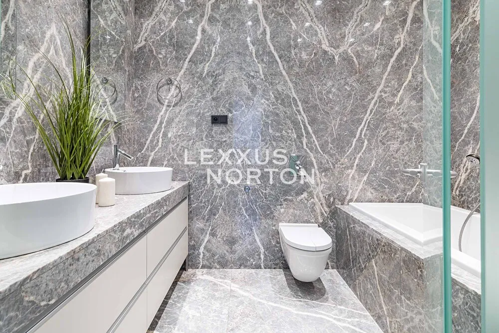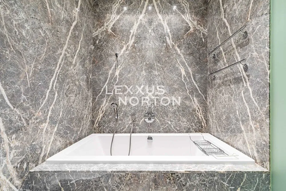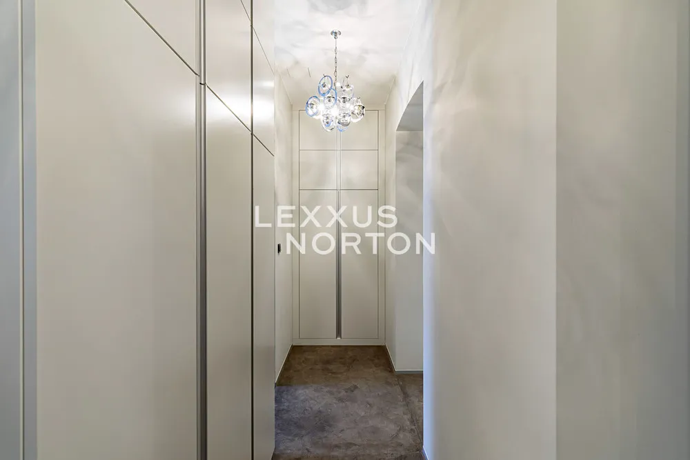 Prostor bytu harmonicky propojuje původní secesních prvky budovy s moderními a nadčasovými materiály vysoké kvality. Masivní dřevěné podlahy, mramor, vestavěný nábytek na míru, posuvné dveře přes celou stěnu na terasu apod.