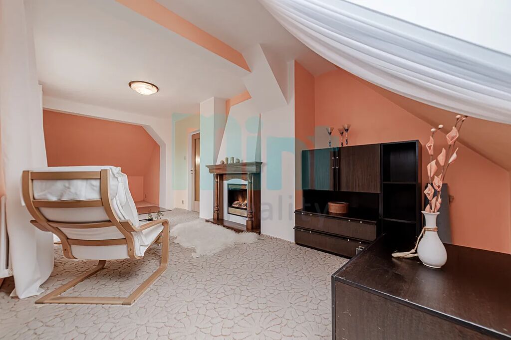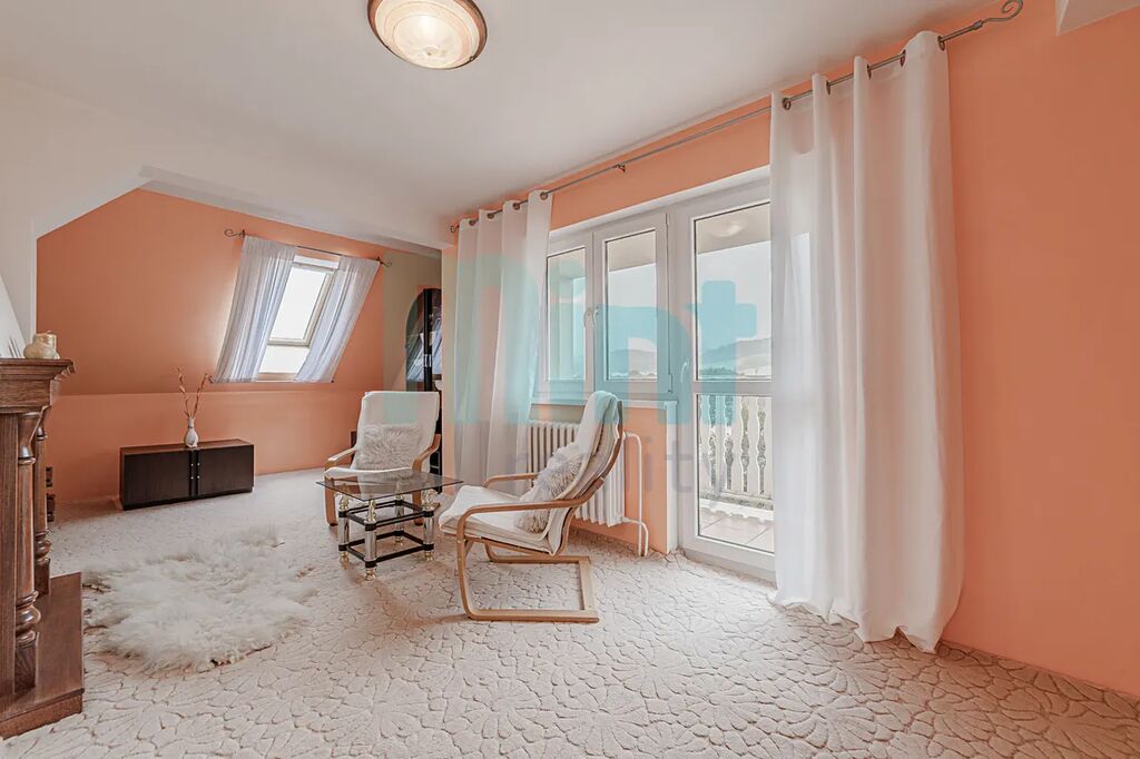 V prvním patře najdete tři samostatné pokoje a prostornou koupelnu s toaletou a vanou. Třetí pokoj disponuje balkonem, ze kterého se otevírá krásný výhled na jihovýchod, jih a jihozápad. Přízemí a první patro jsou propojené otevřeným schodištěm