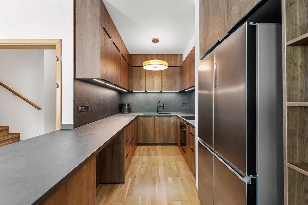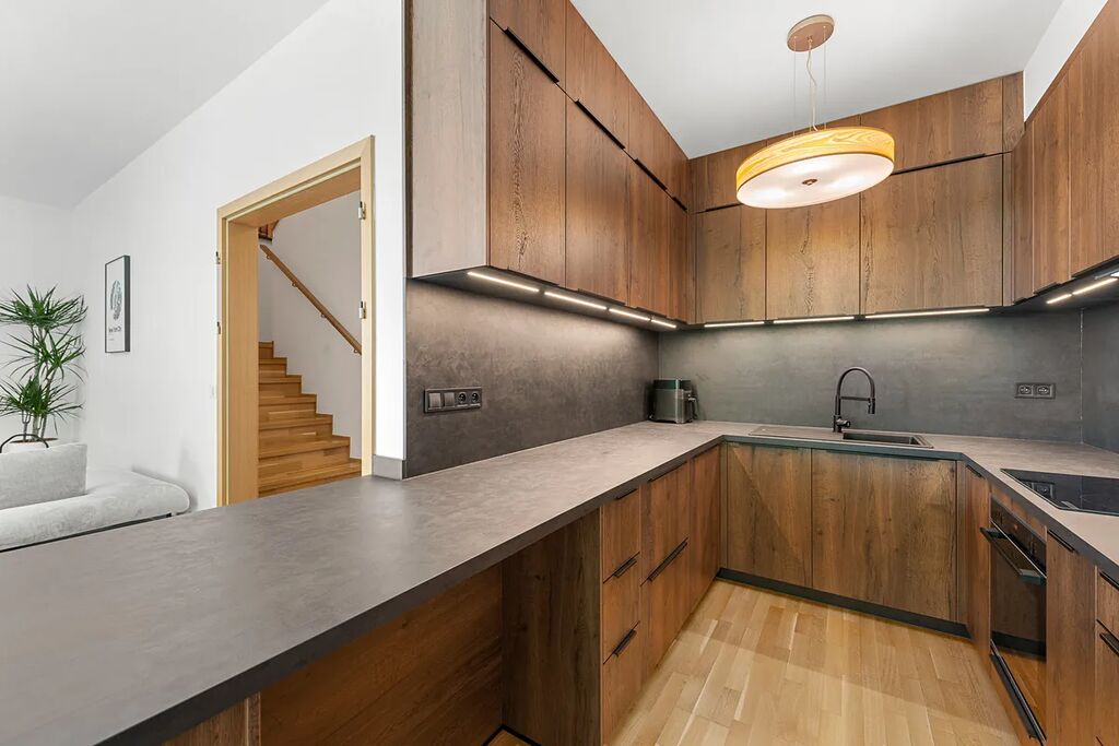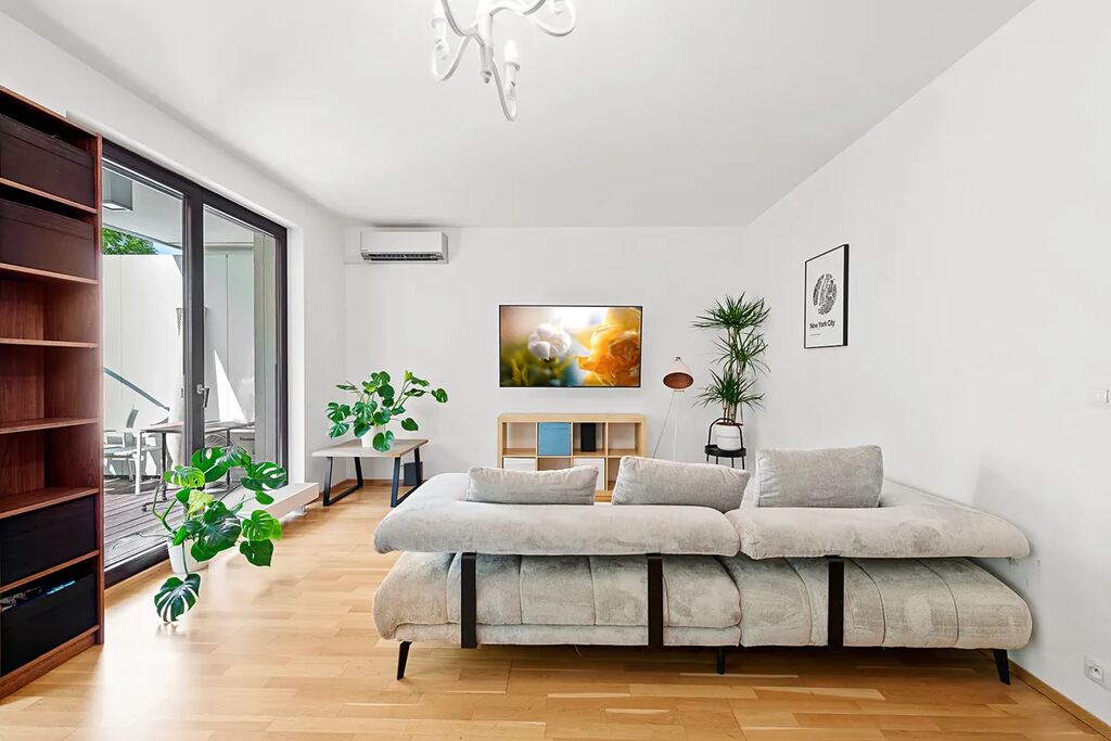 V přízemí bytu se nachází prostorný obývací pokoj s úplně novým kuchyňským koutem vybaveným kvalitními spotřebiči. Z obývací části je přímý vstup na předzahrádku s klidným posezením, kde najdete gril a vířivku – ideální místo pro relaxaci. V přízemí je také nová klimatizace, která zajišťuje příjemné prostředí i v horkých dnech.