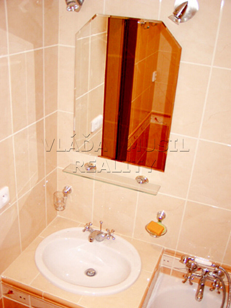 V bytě jsou plovoucí podlahy (obývací pokoj a ložnice) a dlažba (kuchyňský kout, předsíň a koupelna), na stěnách jsou štuky, okna jsou plastová, příslušenství je zděné. V koupelně je umyvadlo se skříňkou, zrcadlo, rohová vana, závěsné WC a místo pro pračku (včetně přívodu vody a napojení na odpad). Na stěnách jsou obklady. V bytě je vybavený kuchyňský kout - kuchyňská linka na míru s vestavěnými spotřebiči (plynová varná deska, elektrická trouba a digestoř). Lednice s mrazákem na fotografii není momentálně k dispozici, ale v případě požadavku nového nájemníka ji majitel zajistí. V předsíni jsou velké vestavěné zrcadlové skříně na míru. Dále je byt nevybavený – postel a stůl se židlemi na fotografiích nejsou součástí bytu. Lze kabelová TV a internet.