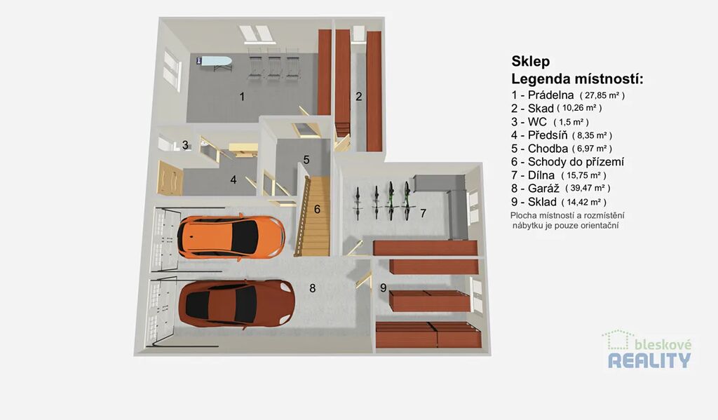V suterénu se nachází prádelna, dílna, skladovací prostory a dvojgaráž (viz. přiložené 3D plánky).