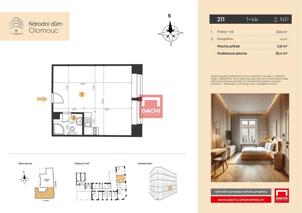 V rámci projektu nabízíme byt č. 211 o dispozici 1+kk s podlahovou plochou 35,4m, který se nachází ve 2. nadzemním podlaží.