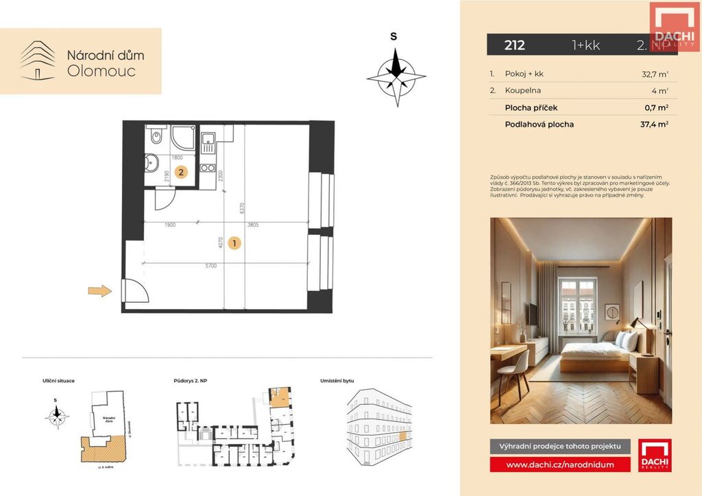 V rámci projektu nabízíme byt č. 212 o dispozici 1+kk s podlahovou plochou 37,4m, který se nachází ve 2. nadzemním podlaží.