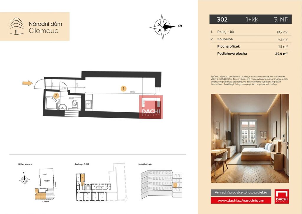 V rámci projektu nabízíme byt č. 302 o dispozici 1+kk s podlahovou plochou 24,9 m, který se nachází ve 3. nadzemním podlaží.