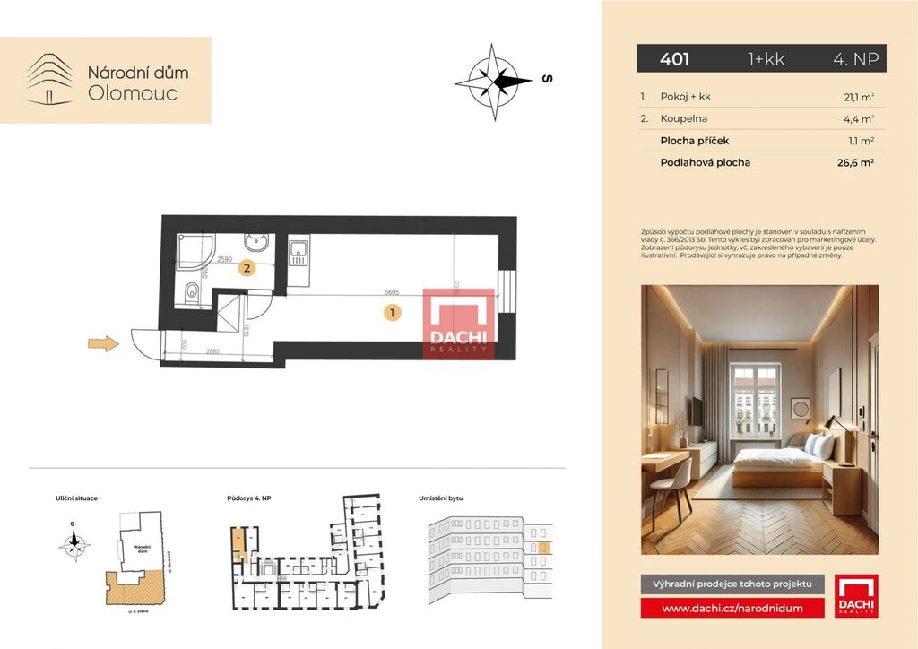 V rámci projektu nabízíme byt č. 401 o dispozici 1+kk s podlahovou plochou 26,6 m, který se nachází ve 4. nadzemním podlaží.