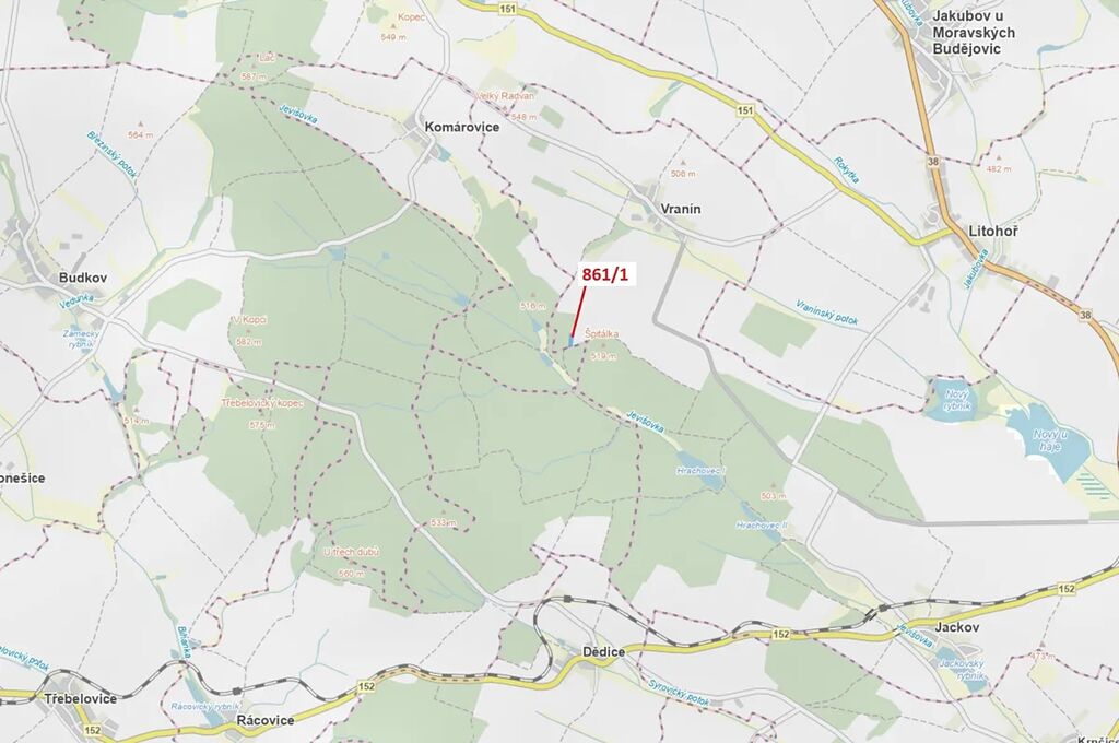 Lesní pozemek o výměře 3 604 m2, parcelní číslo 861/1, podíl 1/1, katastrální území Vranín, obec Moravské Budějovice, obec s rozšířenou působností Moravské Budějovice, okres Třebíč, Kraj Vysočina. Částečně po těžbě.