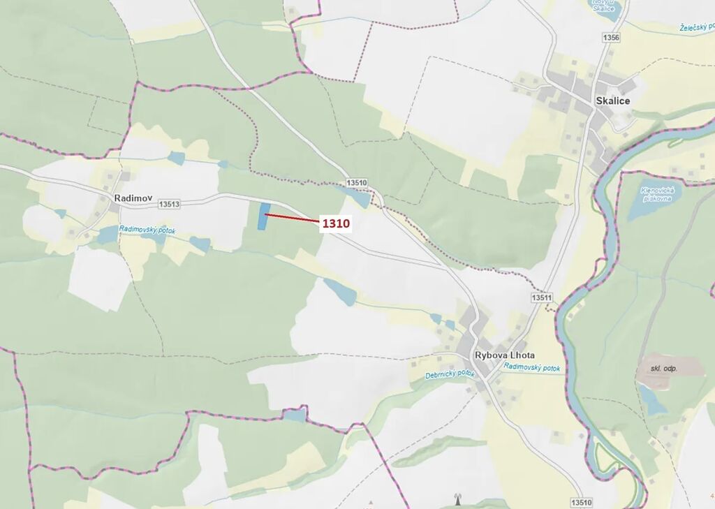 Lesní pozemek o výměře 7441 m2, parcelní číslo 1310, podíl 1/1, katastrální území Rybova Lhota, obec Skalice, obec s rozšířenou působností Soběslav, okres Tábor, Jihočeský kraj. Po těžbě.