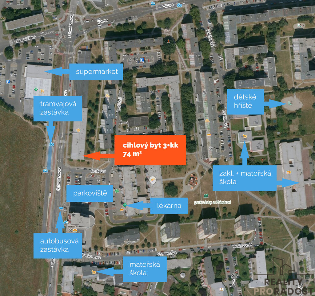 Byt se nachází v oblíbené lokalitě s veškerou občanskou vybaveností – školy, školky, lékaři, lékárny, restaurace, supermarket (Billa), večerka... Výborné spojení s centrem města - zastávka MHD před domem (tramvaj i autobus). U domu je také velké veřejné parkoviště. Okolí nabízí možnost relaxace v přírodě – síť cyklostezek, rybník Hamrys, park Lásky a Přátelství, aj.