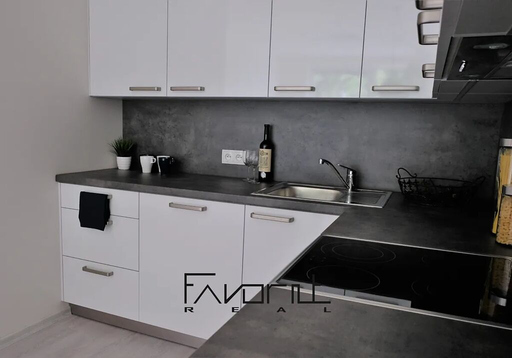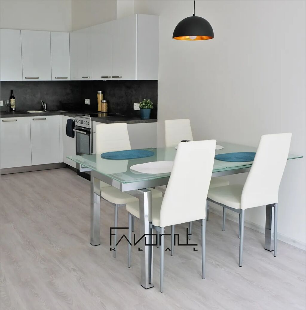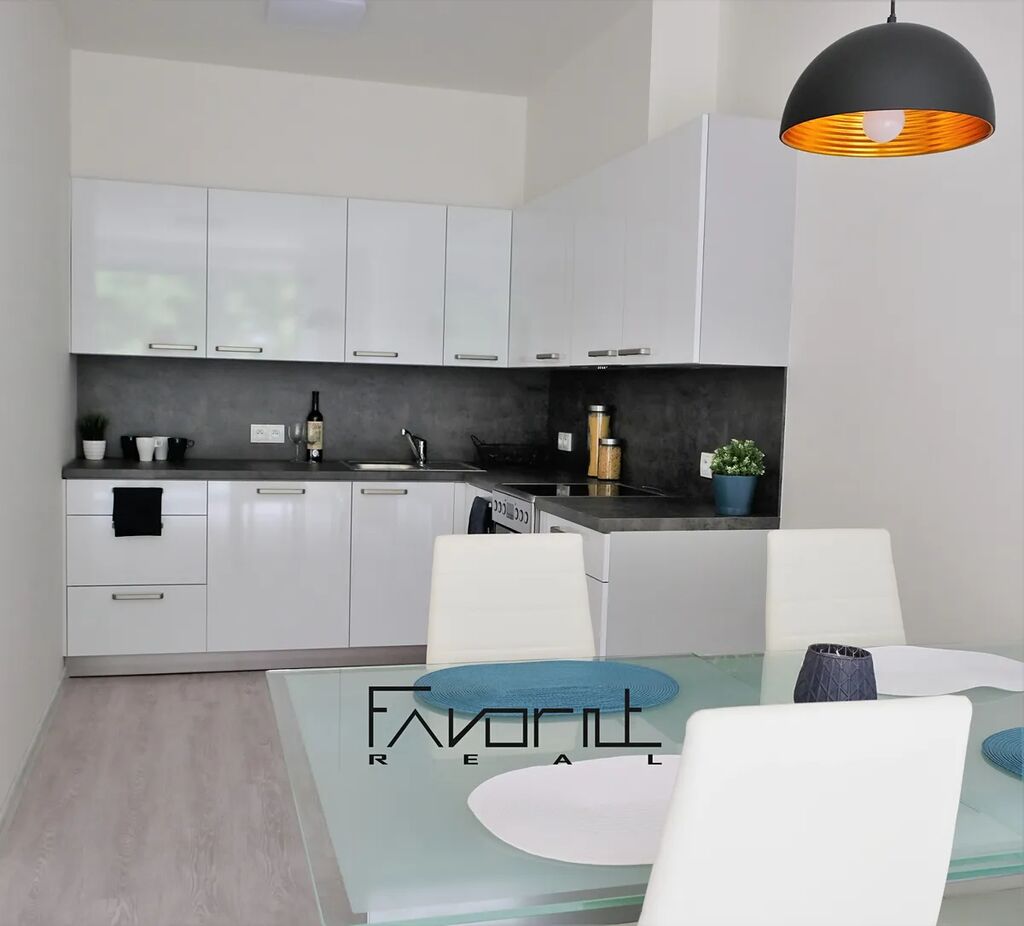 V bytě je vše nové a nepoužité (podlahy, sanita, kuchyňská linka na míru včetně el. trouby, el. varné desky, myčky a digestoře).
