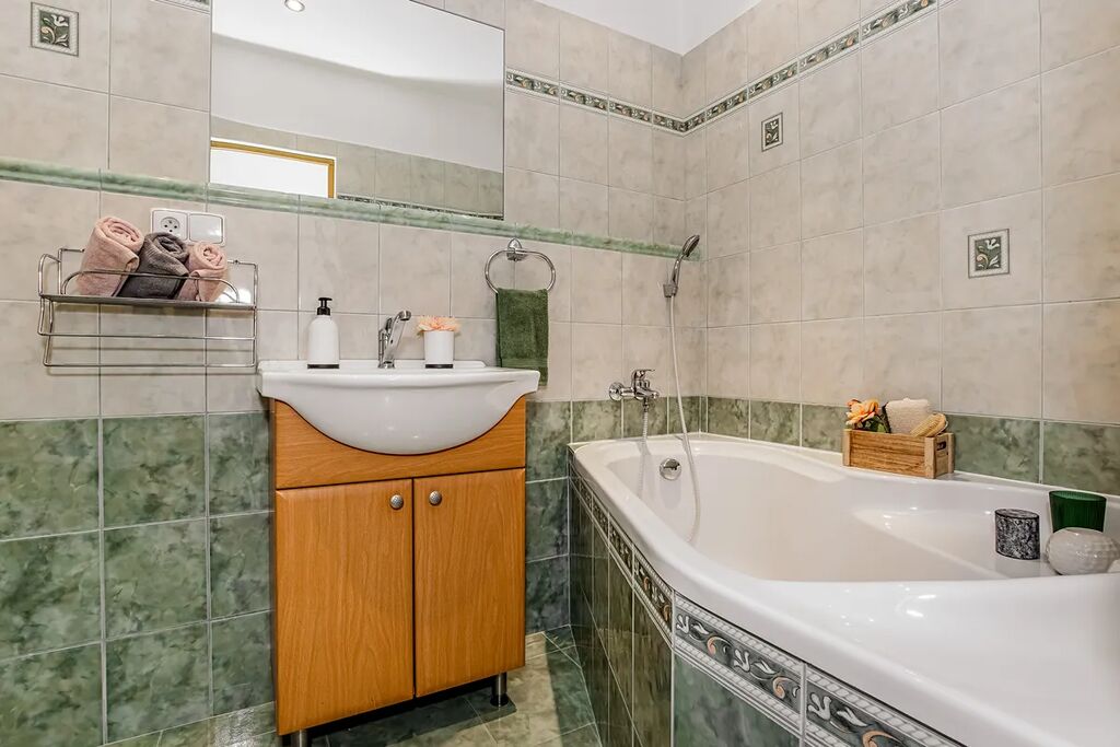 V bytě je zděné jádro, kde koupelna a WC jsou oddělené. V koupelně je vana a umyvadlová skříňka. Součástí chodby jsou skříně s velkým úložným prostorem.