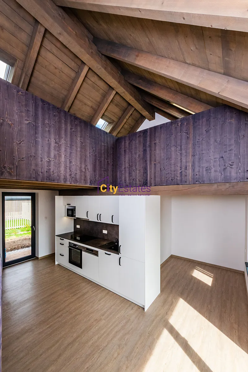 Do bytu, který je ve 2 podlaží domu, vstoupítešatnou, ze které vejdete do hlavního obývacího prostoru s kuchyňským koutem nebo do koupelny s toaletou. Na obývací pokoj navazuje lodžie. Přízemí je o výměře 30m2, v patře je galerie 16m2.
