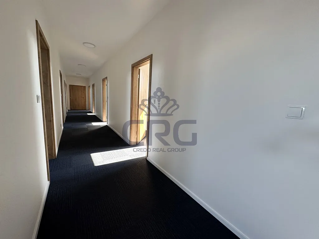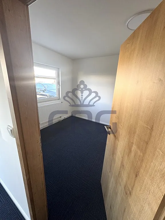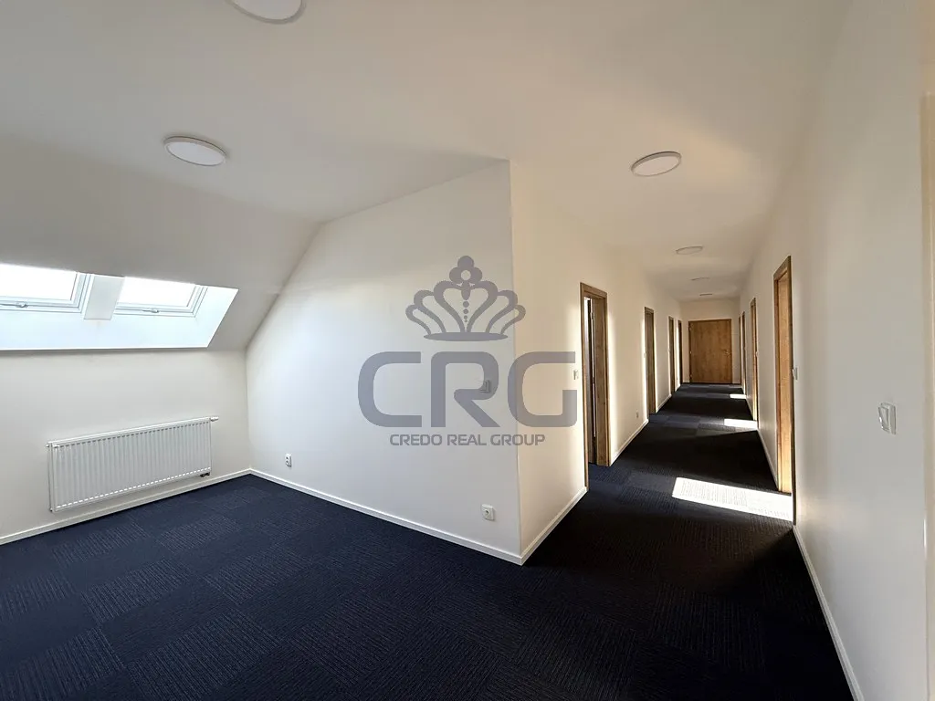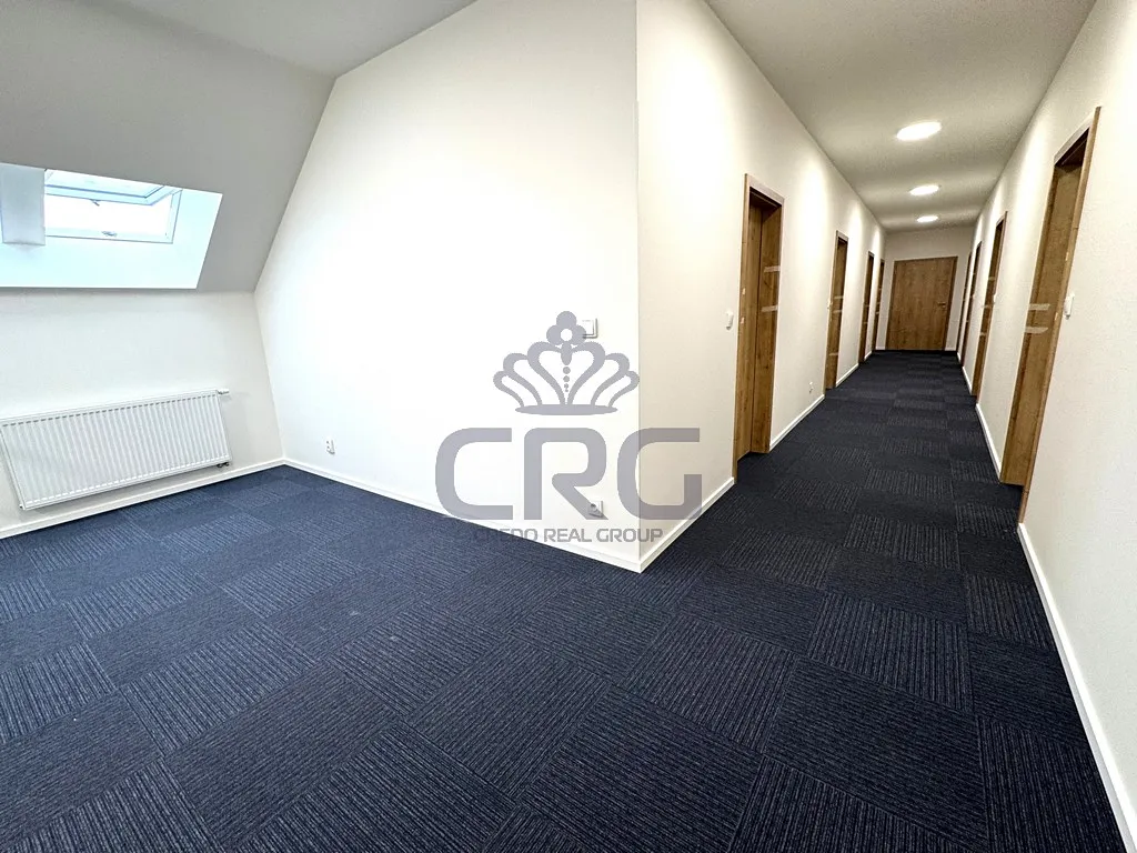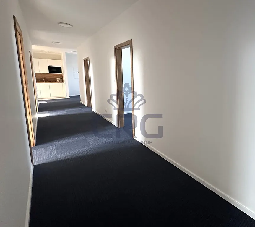Ve vstupní hale je ideální místo pro sedačku s konferenčním místem, ale může tam také sedět například recepční či zde může být umístěn sekretariát. Kuchyňka o výměře cca 1,60m2 je vybavena lednicí, mikrovlnnou troubou a spoustou úložného prostoru. WC jsou samostatné, každé vždy s umyvadlem o výměře cca 1,26m2 a cca 2,11m2. Chodba vedoucí do jednotlivých místností má výměru cca 23,70m2. Kanceláře jsou samostatné, celkem je jich osm. Každá je vybavena klimatizací značky Sinclair, která chladí i topí. Místnosti jsou poměrně veliké a jejich výměra činí cca 12,94m2, cca 12,84m2, cca 12,76m2, cca 11,70m2, cca 14,90m2, cca 11,06m2 a 2x 12,08m2. Na konci chodby je samostatná místnost o výměře cca 3,10m2, která může sloužit jako úklidová místnost, archiv, ale i jako serverovna.
