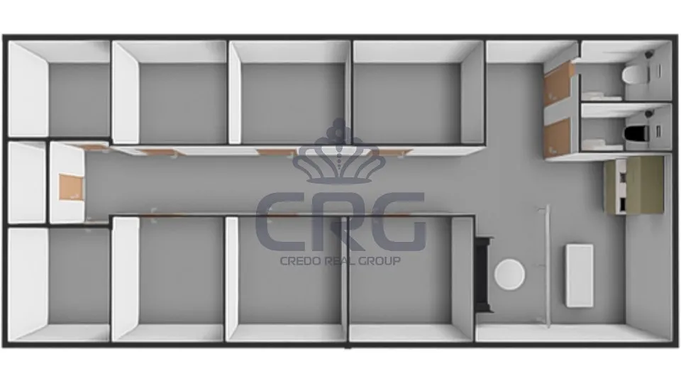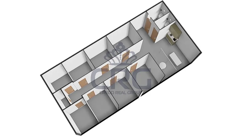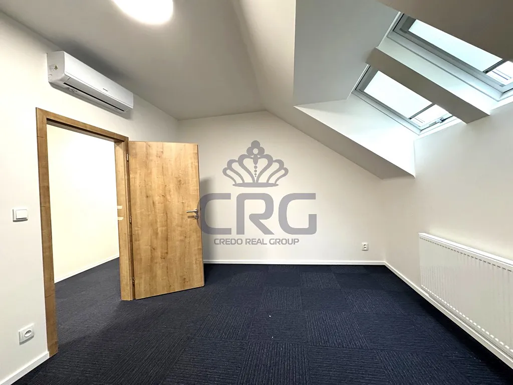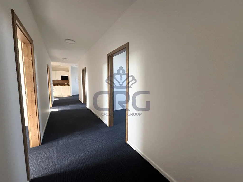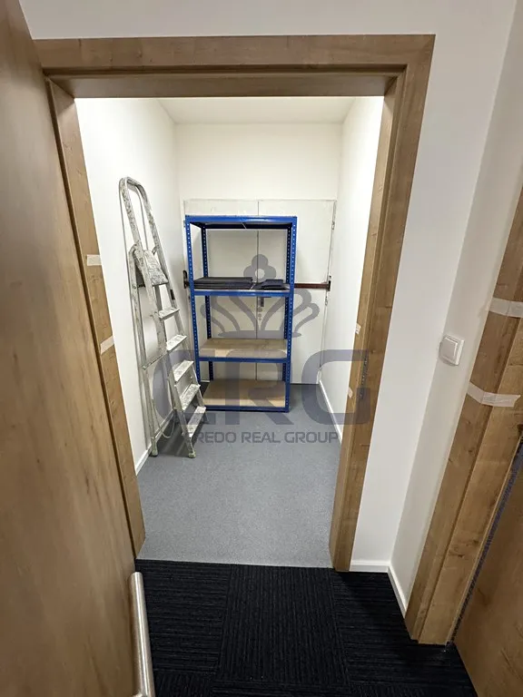 Ve vstupní hale je ideální místo pro sedačku s konferenčním místem, ale může tam také sedět například recepční či zde může být umístěn sekretariát. Kuchyňka o výměře cca 1,60m2 je vybavena lednicí, mikrovlnnou troubou a spoustou úložného prostoru. WC jsou samostatné, každé vždy s umyvadlem o výměře cca 1,26m2 a cca 2,11m2. Chodba vedoucí do jednotlivých místností má výměru cca 23,70m2. Kanceláře jsou samostatné, celkem je jich osm. Každá je vybavena klimatizací značky Sinclair, která chladí i topí. Místnosti jsou poměrně veliké a jejich výměra činí cca 12,94m2, cca 12,84m2, cca 12,76m2, cca 11,70m2, cca 14,90m2, cca 11,06m2 a 2x 12,08m2. Na konci chodby je samostatná místnost o výměře cca 3,10m2, která může sloužit jako úklidová místnost, archiv, ale i jako serverovna.