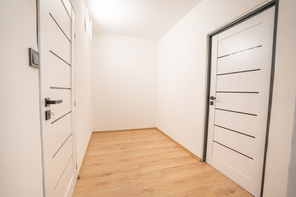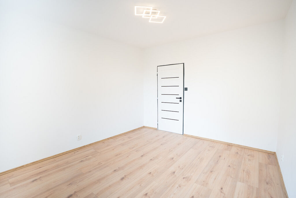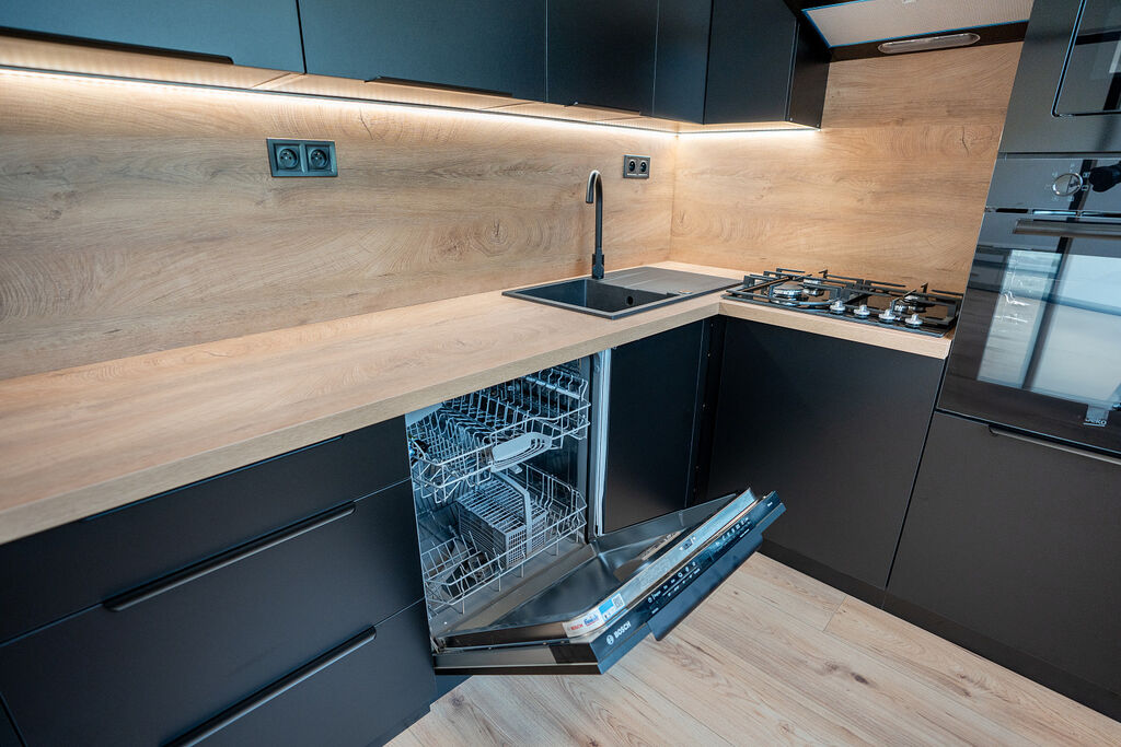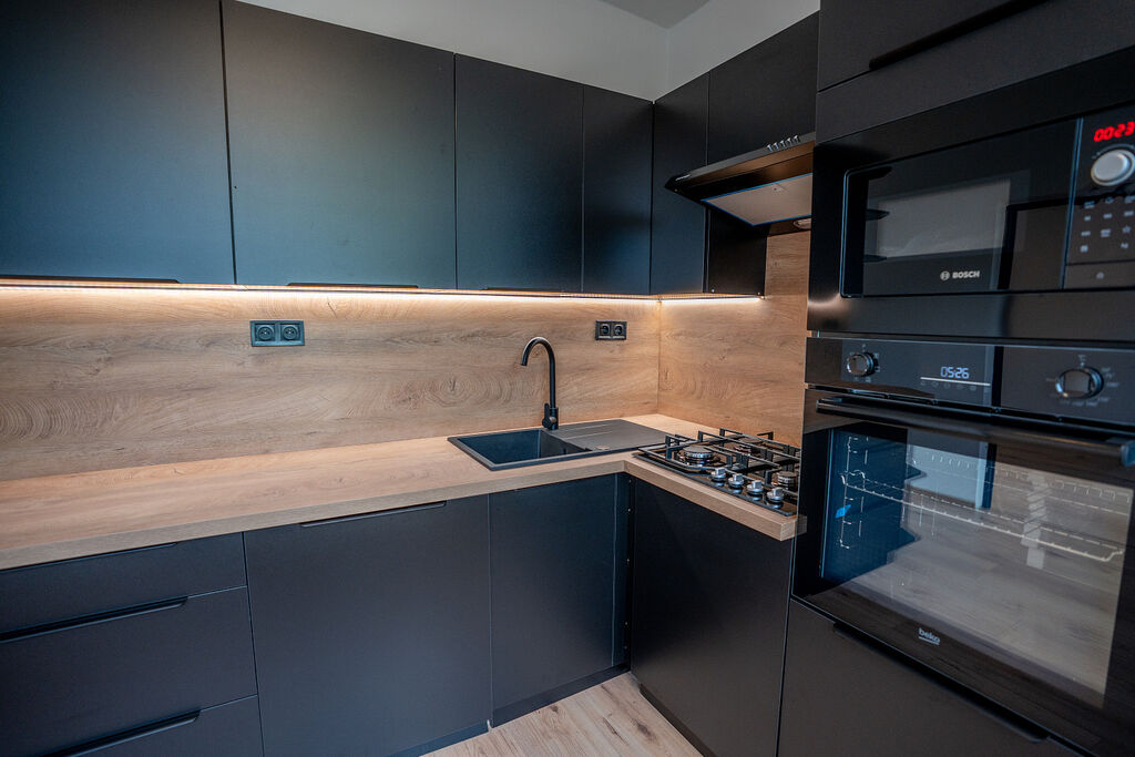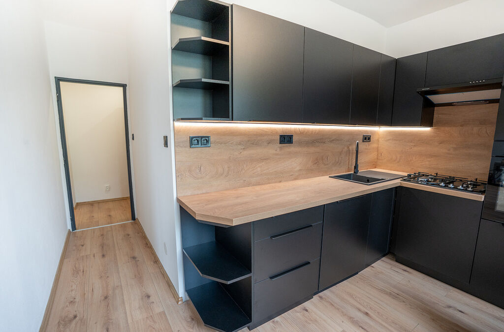 Byt prošel rozsáhlou rekonstrukcí, byly realizovány nové podlahy, omítky, interiérové dveře i vybavení. V části bytu byly rovněž obnoveny elektrické rozvody a rozvody vody. Kuchyňská linka v kombinaci černé barvy a dřevodekoru působí moderně a elegantně. Je vybavena granitovým dřezem s černou baterií a vestavěnými spotřebiči, myčkou Bosch, mikrovlnnou troubou Bosch, troubou Beko, plynovou varnou deskou Mora a lednicí s mrazákem značky Beko. Vše doplňuje praktické LED podsvícení.