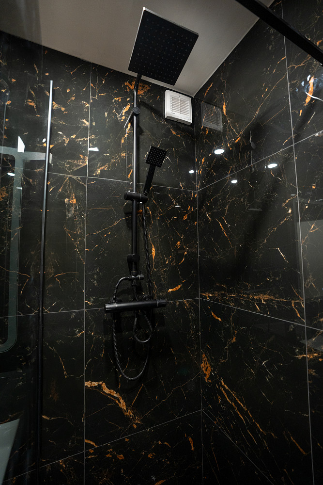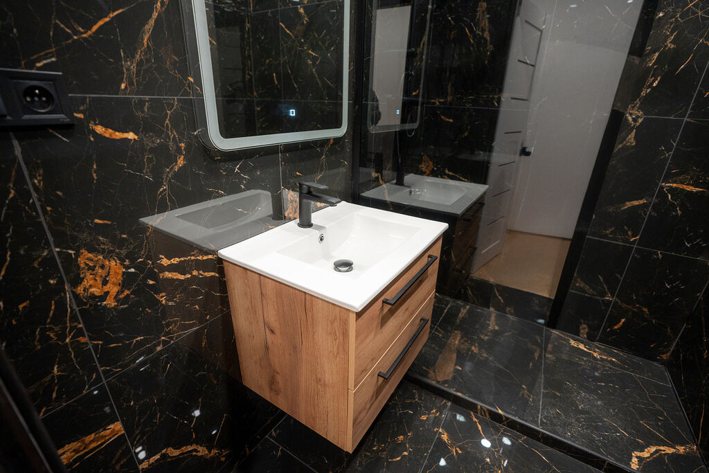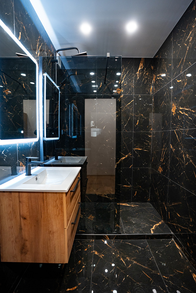Koupelna a samostatné WC jsou laděny do elegantního stylu s výraznými obklady v černém mramorovém designu. V koupelně se nachází prostorný walk-in sprchový kout bez vaničky, designové zrcadlo s dotykovým ovládáním a černé baterie, které esteticky navazují na styl celého bytu.