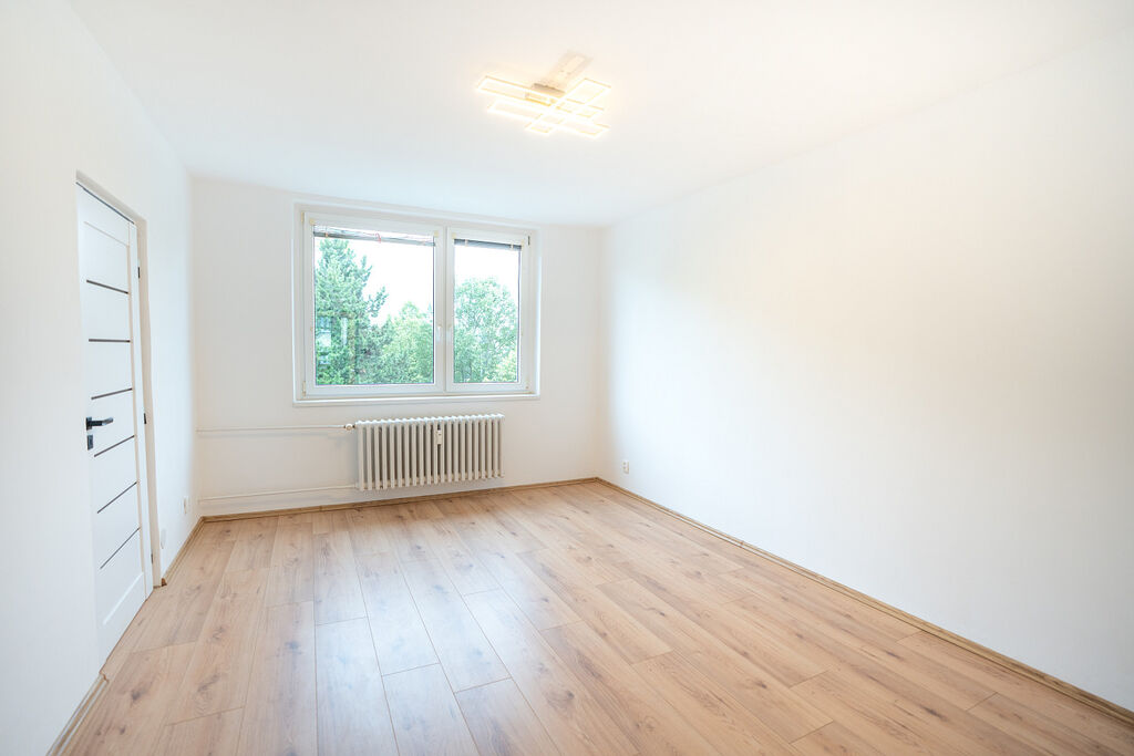Dispozičně je byt rozdělen na předsíň, kuchyni s oknem, obývací pokoj, ložnici se vstupem na balkon, koupelnu, samostatné WC a praktickou středovou místnost mezi pokoji, která je ideální jako šatna, komora nebo domácí pracovní kout.