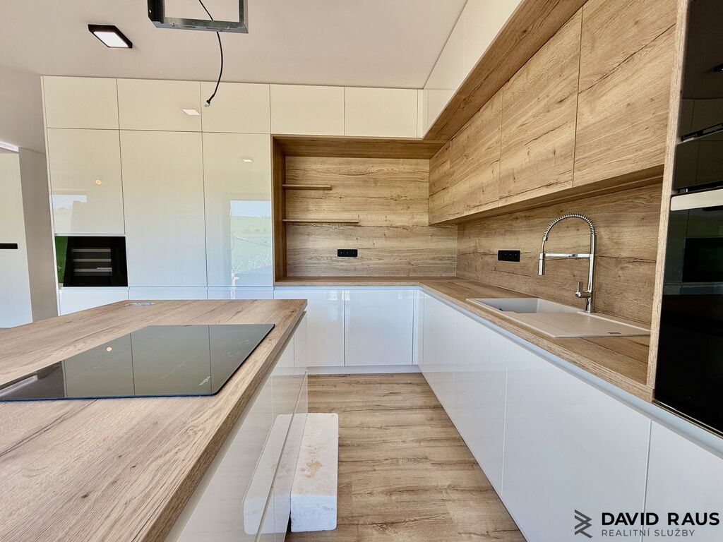 Dispozice a interiér: Hlavním vchodem vstoupíte do předsíně (5,20 m²) dále pak do centrální chodby (7,65 m²), ze které se dostanete přímo do technické místnosti (5,40 m²) i garáže (24 m²), která je vybavena dálkově ovládanými vraty a vnitřním přístupem. V garáži je navíc připraveno napojení pro nabíjení elektromobilu. Dominantou přízemí je prostorný a prosvětlený obývací pokoj (21,90 m²) s vysokými podhledy a efektním podsvícením, který je propojený s moderní kuchyní (26,25 m²). Ta je laděna do elegantního bílého lesku v kombinaci s přírodními dřevěnými prvky a disponuje ostrůvkem s indukční varnou deskou, šuplíky z obou stran a stropní digestoří. Kuchyně je vybavena vestavěnými spotřebiči značky Whirlpool a stylovou zabudovanou vinotékou. Chytře ukrytý vstup vede do spíže, která skýtá dostatek úložného prostoru. Velká francouzská okna v obývací části zajišťují přirozené světlo a zároveň umožňují vstup na terasu s nádherným výhledem do okolní přírody. V přízemí se nachází také jedna samostatná místnost (8,45 m²) – umístěná hned vedle schodiště.