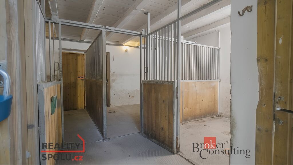 V přízemí se nachází prostorná garáž vhodná pro traktor či jinou techniku a stáj se čtyřmi boxy pro koně.