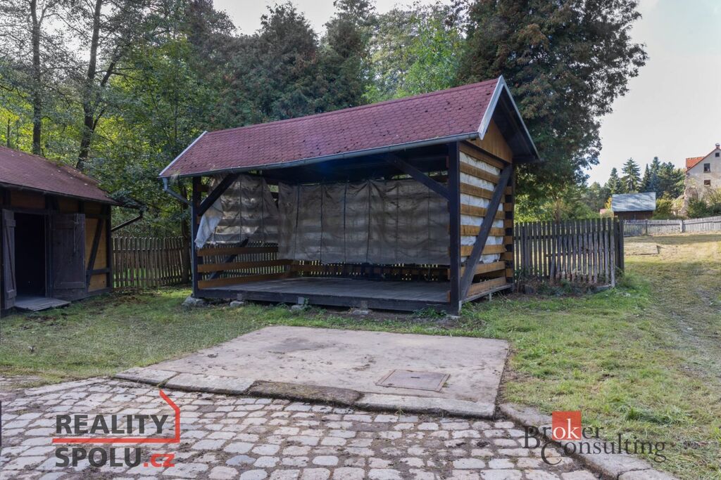 Součástí areálu jsou dvě hospodářské stavby – jedna uzavíratelná a druhá otevřená, vhodná například pro ustájení techniky či skladování sena.