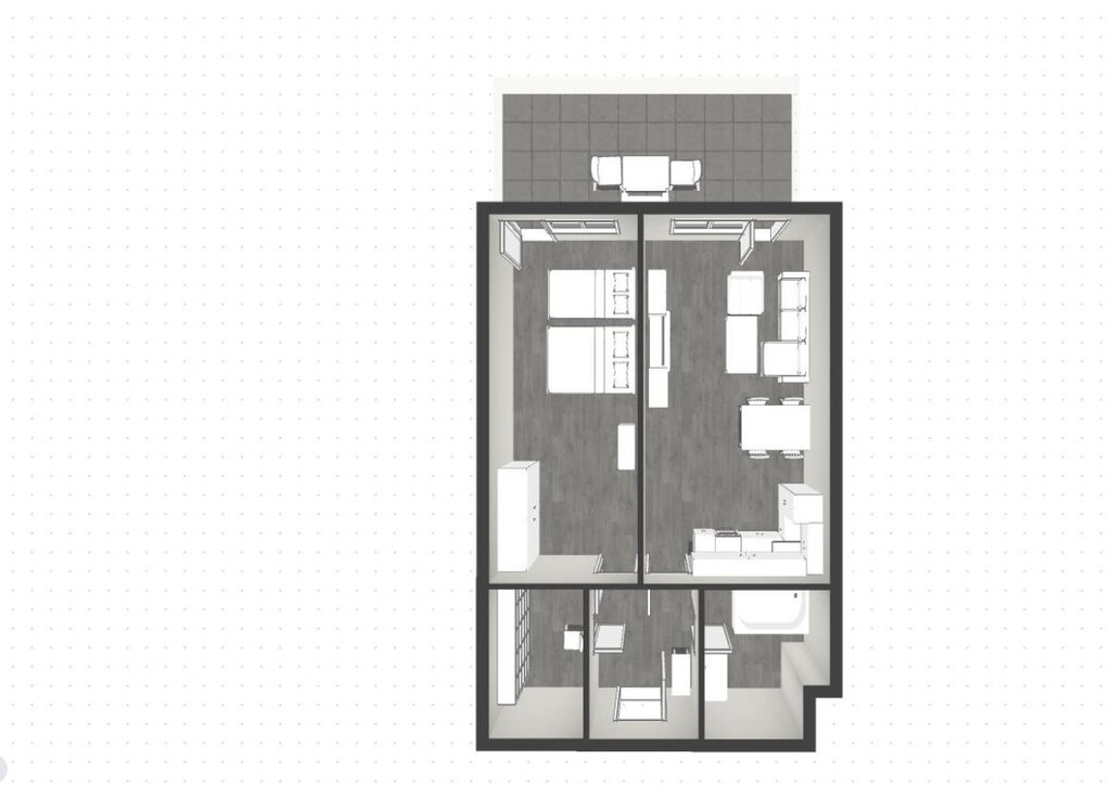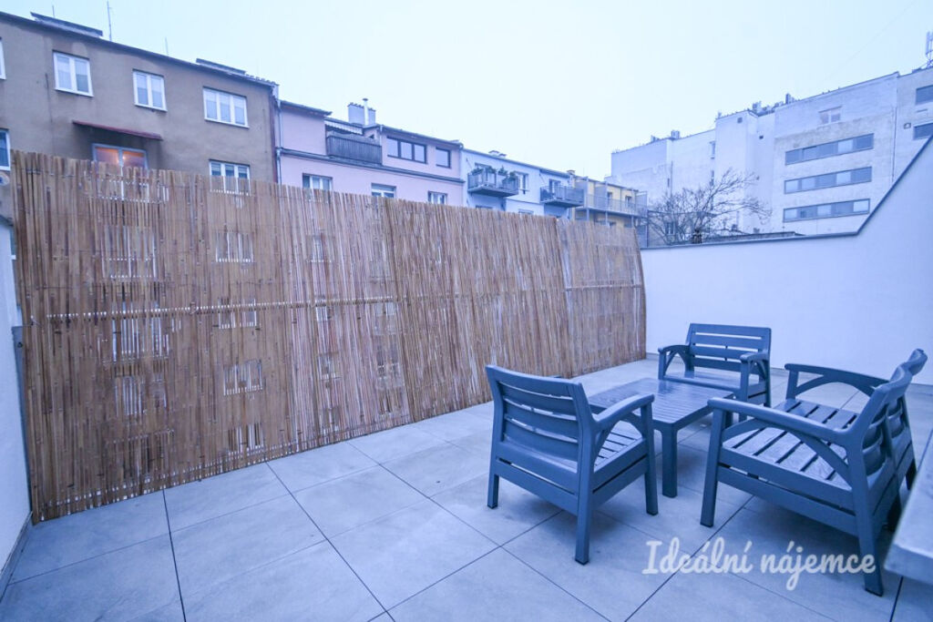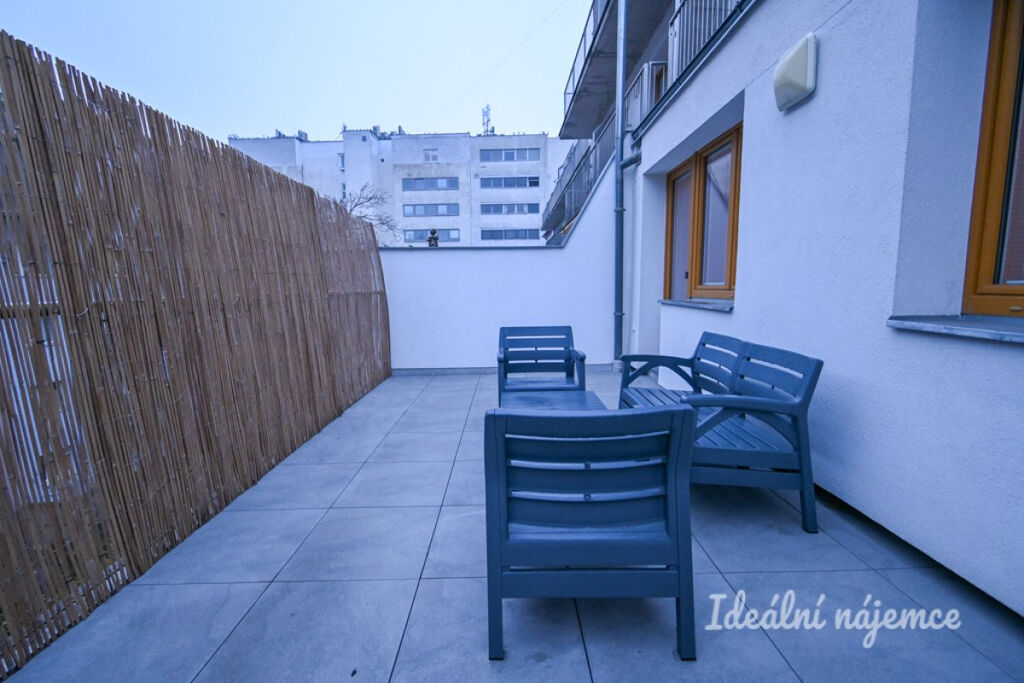 V koupelně najdeme vanu, umyvadlo a topný žebřík. Byt dále nabízí velkorysou terasu s venkovním posezením, která je ideální pro odpočinek nebo grilování.