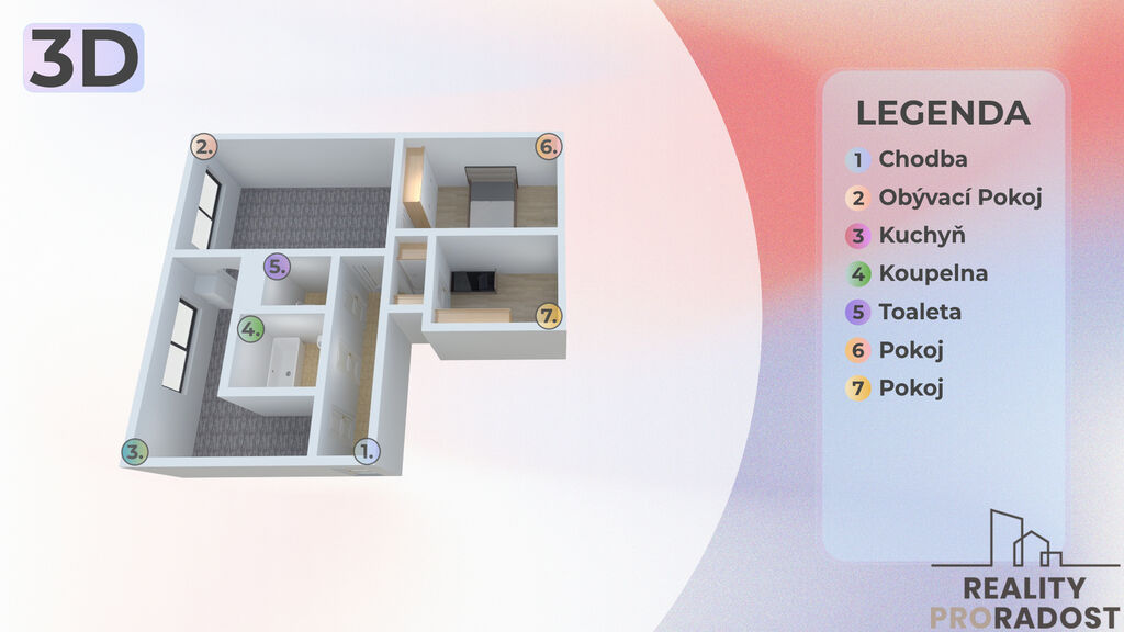 Dispozice bytu je řešena prakticky: po vstupu do prostorné chodby s vestavěnými skříněmi se vlevo nachází kuchyně propojená průchodem s obývacím pokojem. Vpravo od chodby jsou umístěny dva samostatné pokoje, z nichž jeden má přístup na lodžii, ideální pro relaxaci.