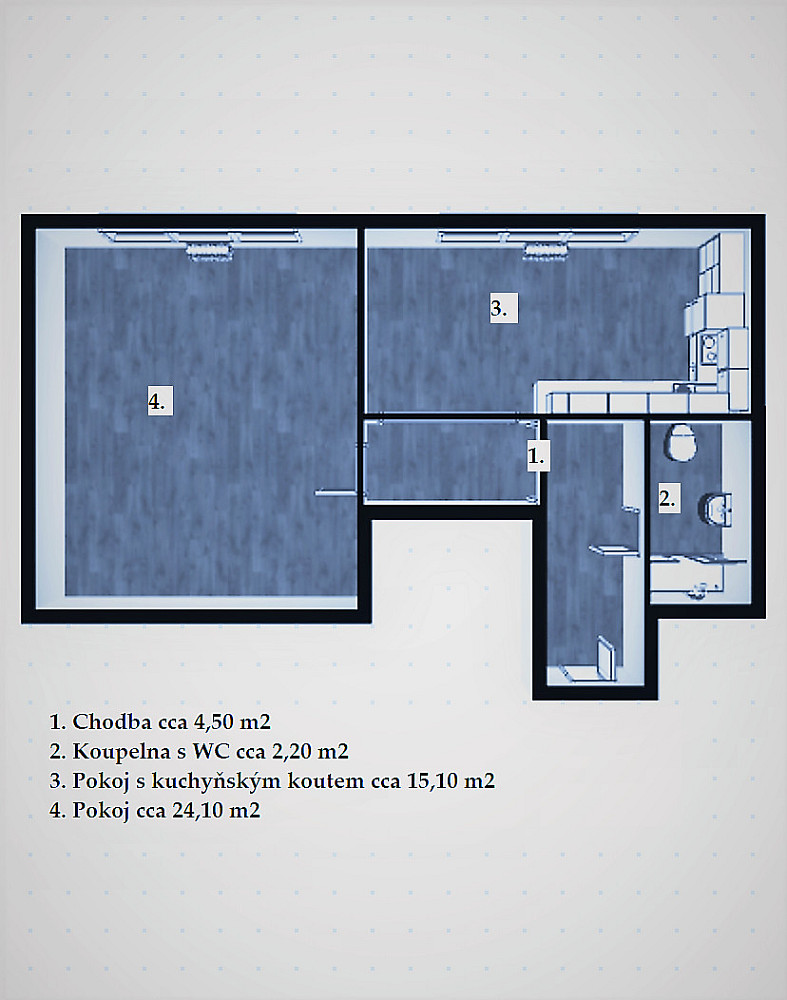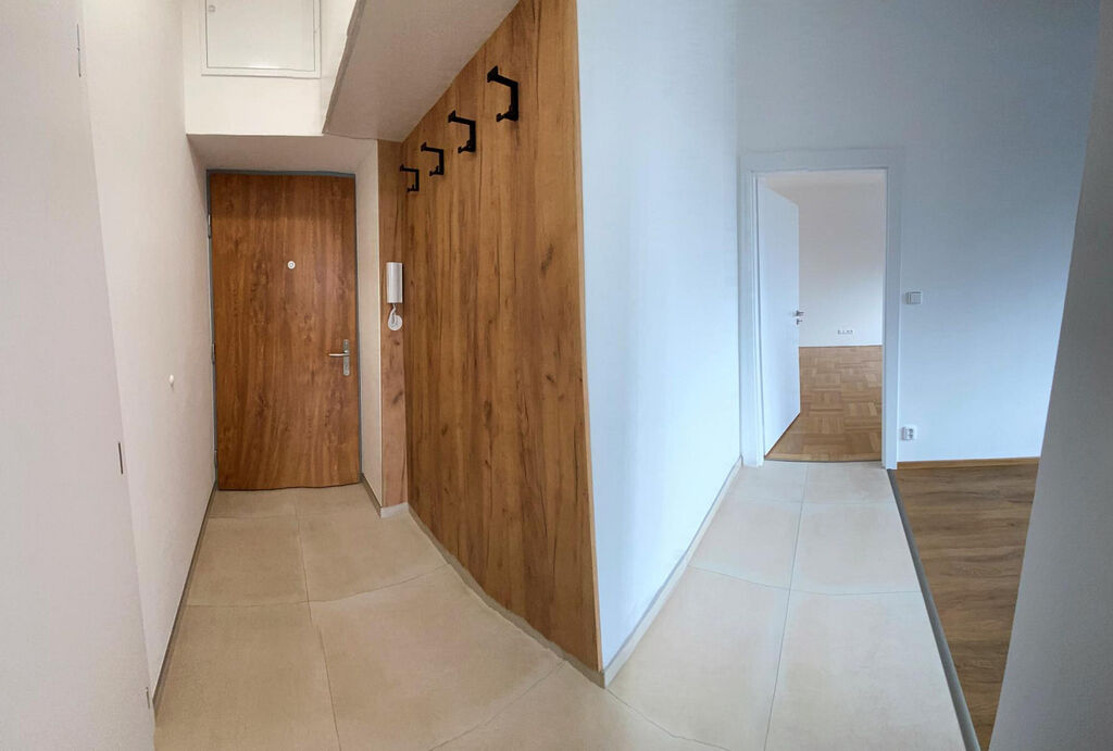 Za vstupními dveřmi se nachází útulná a krásná chodba (cca 4,50 m²) s věšáky a úložným prostorem. Po pravé straně je krásná koupelna s WC, sprchovým koutem, umyvadlem, zrcadlem a koupelnovou skříňkou. Koupelna s toaletou je o výměře cca 2,20 m². Hlavní dominantou je místnost s kuchyňským koutem o velikosti cca 15,10 m². Kuchyňská linka je vybavena lednicí s mrazákem značky Whirlpool, sklo keramickou varnou deskou značky Whirlpool, troubou značky Whirlpool, myčkou nádobí značky Whirlpool a pračkou značky AEG. Velkou výhodou je spoustu úložného prostoru v kuchyňské lince. Vedle této krásné linky se nachází vestavěná skříň. V neposlední řadě se zde nachází prostorný pokoj o výměře cca 24,10 m², který může sloužit jako ložnice, ale zároveň, díky své velikosti, lze zde mít i obývací pokoj. Pokoj s kuchyňským koutem a samostatný pokoj jsou orientovány na Jihovýchod.