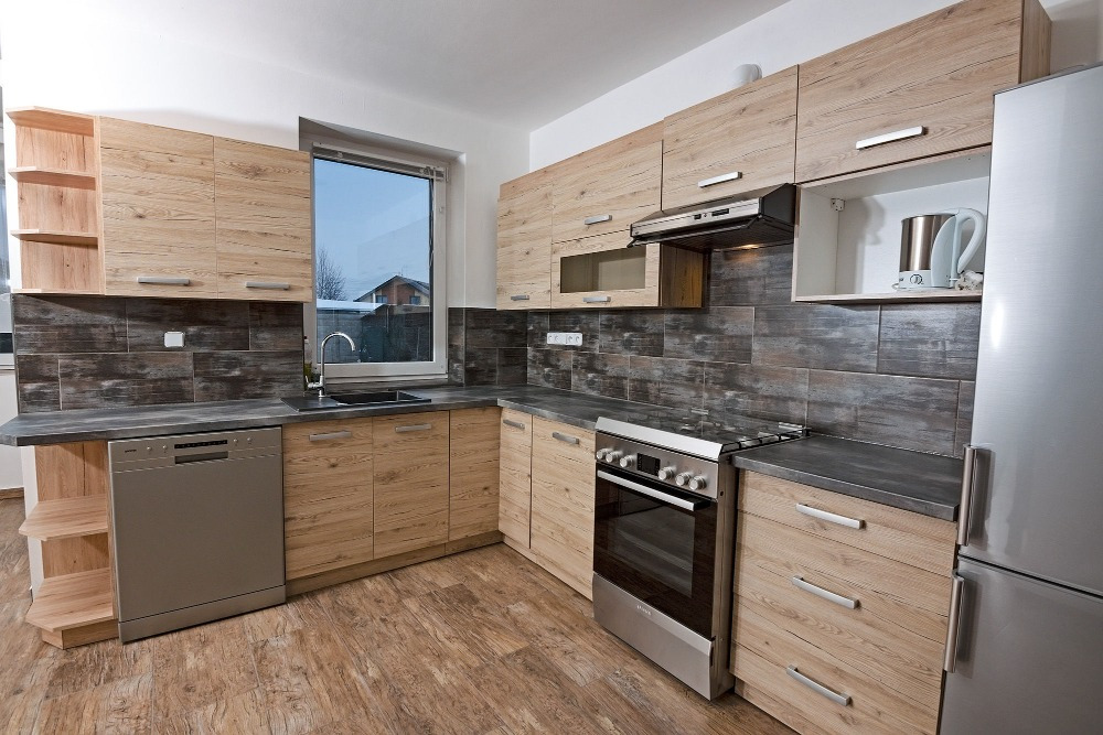 Dům se nabízí částečně vybavený. Kuchyně disponuje sporákem, troubou, digestoří, myčkou a lednicí.. Na kuchyň volně navazuje obývací prostor. Pokoj je nevybavený, nachází se v něm pouze vestavěná skříň. V koupelně je vana i sprchový kout. Toaleta je odděleně a má své umyvadlo. V patře jsou nevybavené pokoje.