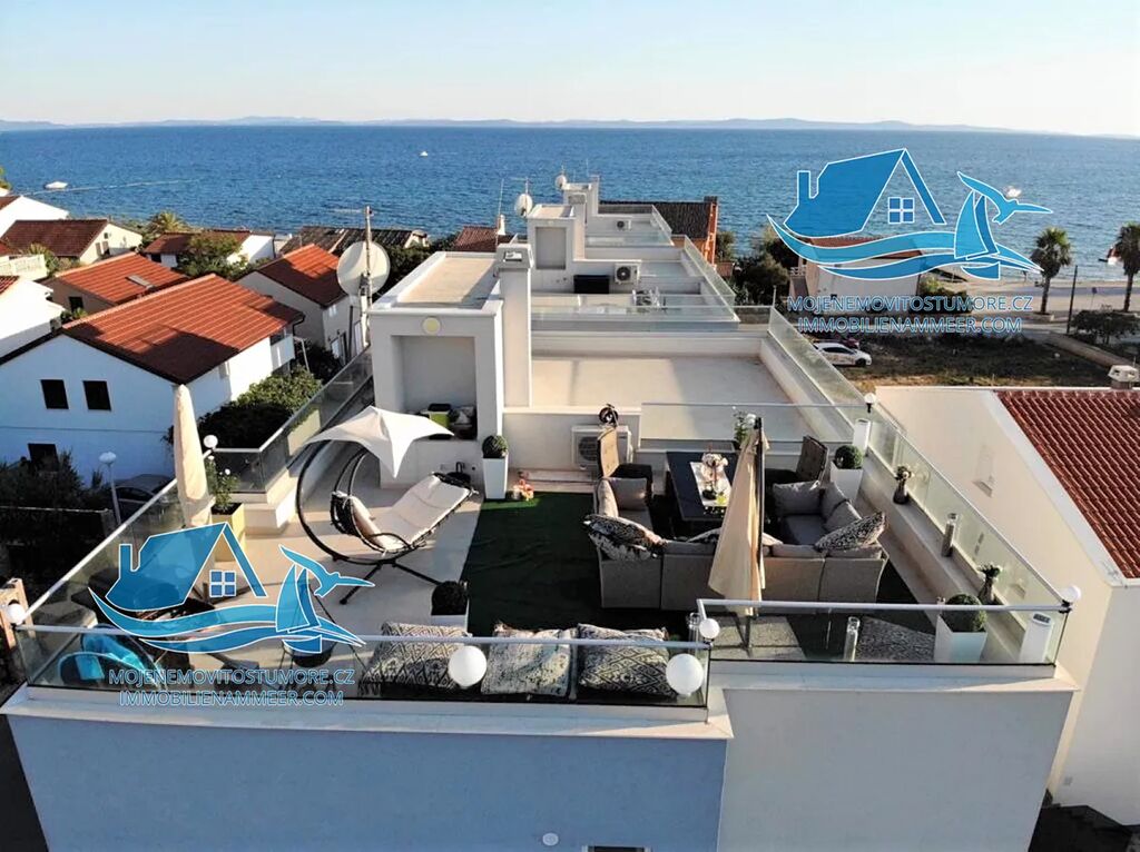 Uvnitř bytu vás přivítá světlý a vzdušný prostor o čisté užitné ploše 71 m², kde je každý metr promyšlený. Dvě pohodlné ložnice, dvě elegantní koupelny, prostorný obývací pokoj s kuchyní a jídelnou, k tomu zastřešená terasa, která láká k dlouhým snídaním i večernímu posezení. A pak je tu třešnička – střešní terasa o rozloze přes 41 m², přístupná pouze z tohoto bytu. Otevřený prostor s výhledem na moře, ostrovy a nezapomenutelné západy slunce vytváří ideální kulisu pro chvíle odpočinku i posezení s přáteli.