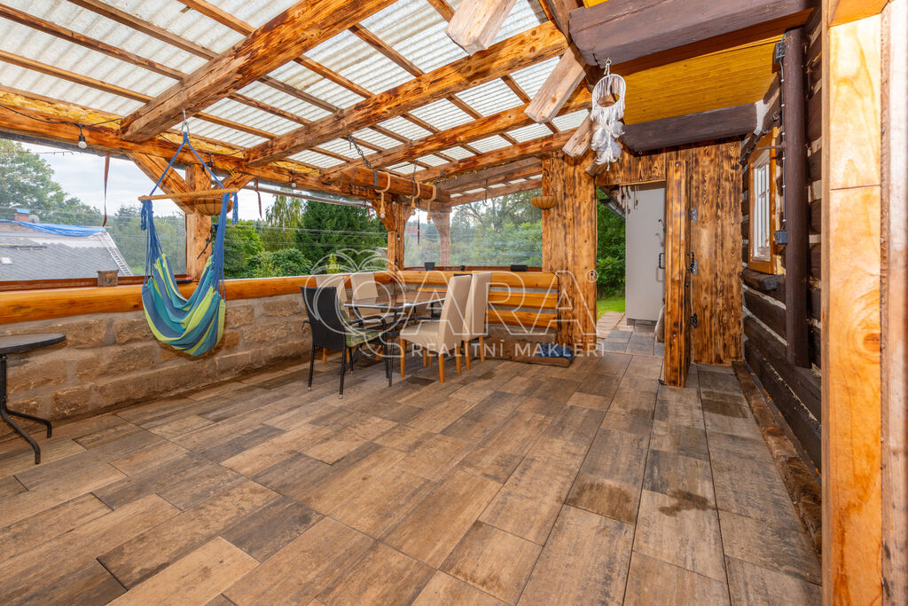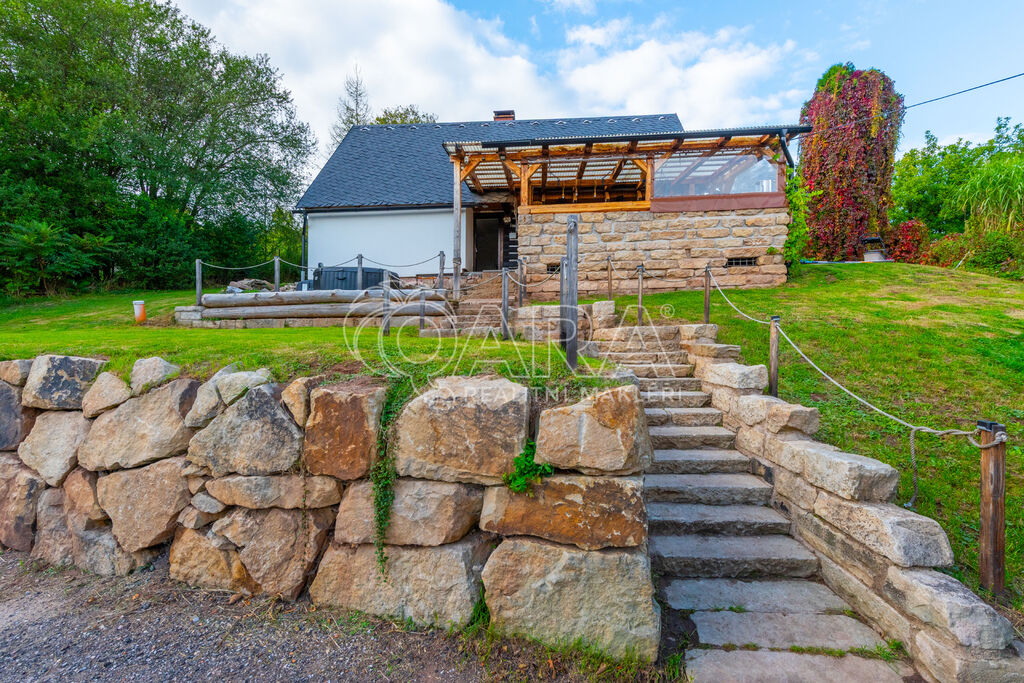 Velkou přidanou hodnotou je prostorná terasa ze štípaného pískovce a masivního dřeva, ideální pro posezení v létě i v zimě. Dominantou domu je pískovcové schodiště před domem a kaskádovitě upravený pozemek, který dodává celé nemovitosti jedinečný charakter.