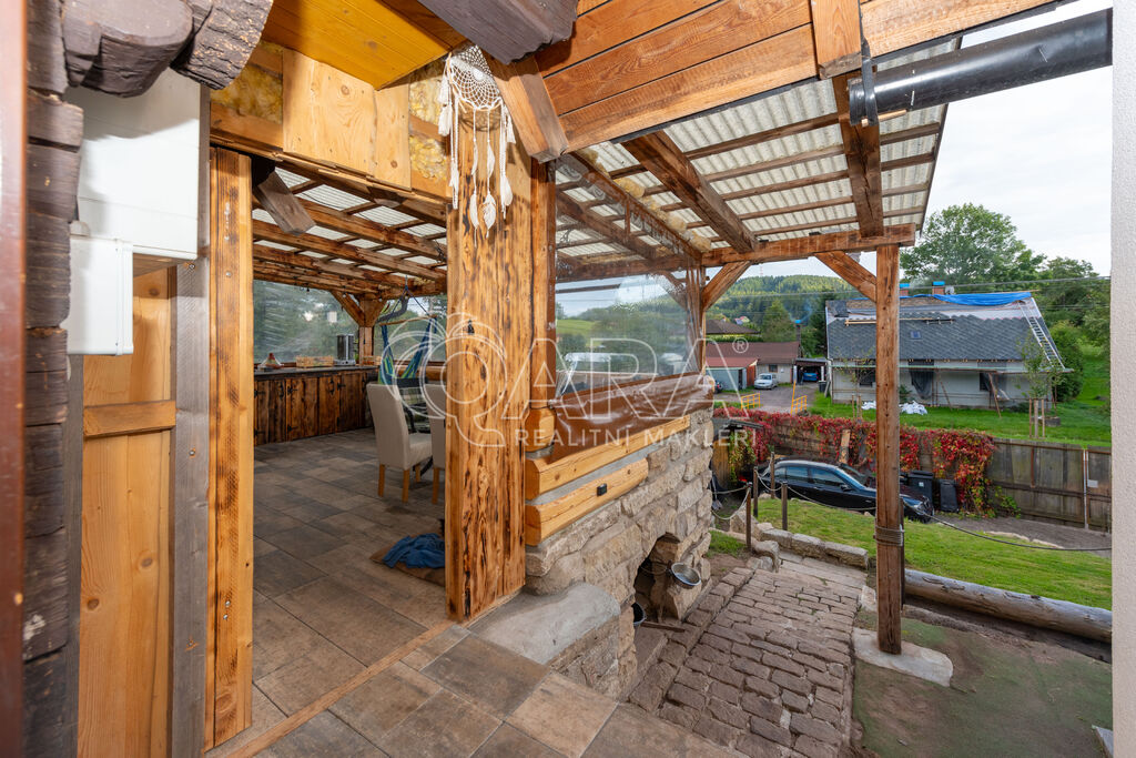 Dům je zděný, částečně roubený a nabízí dispozici 4+kk: