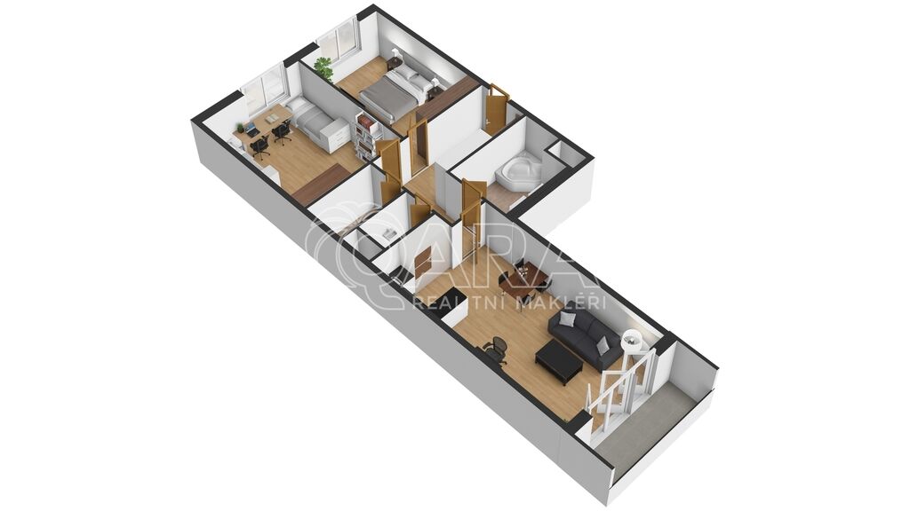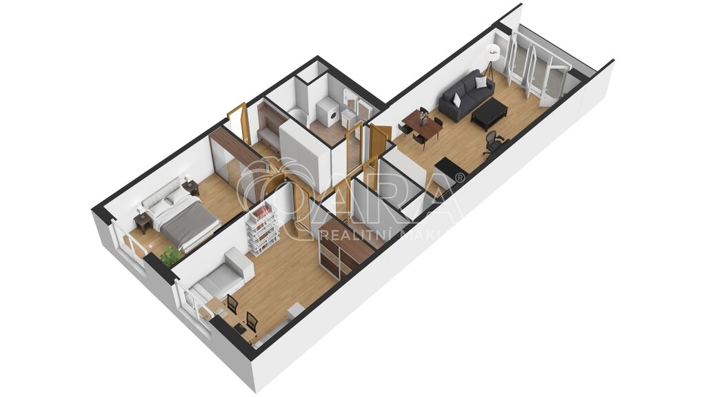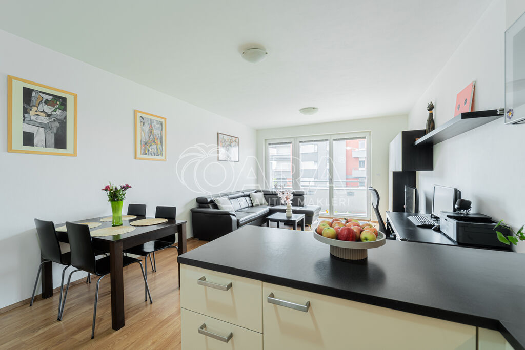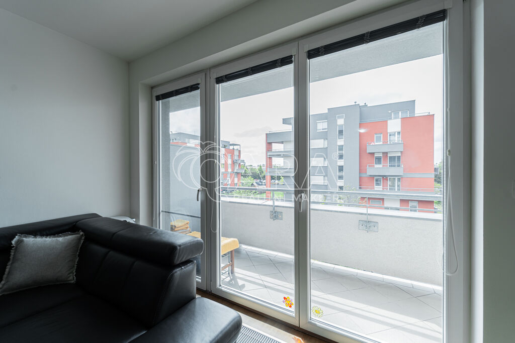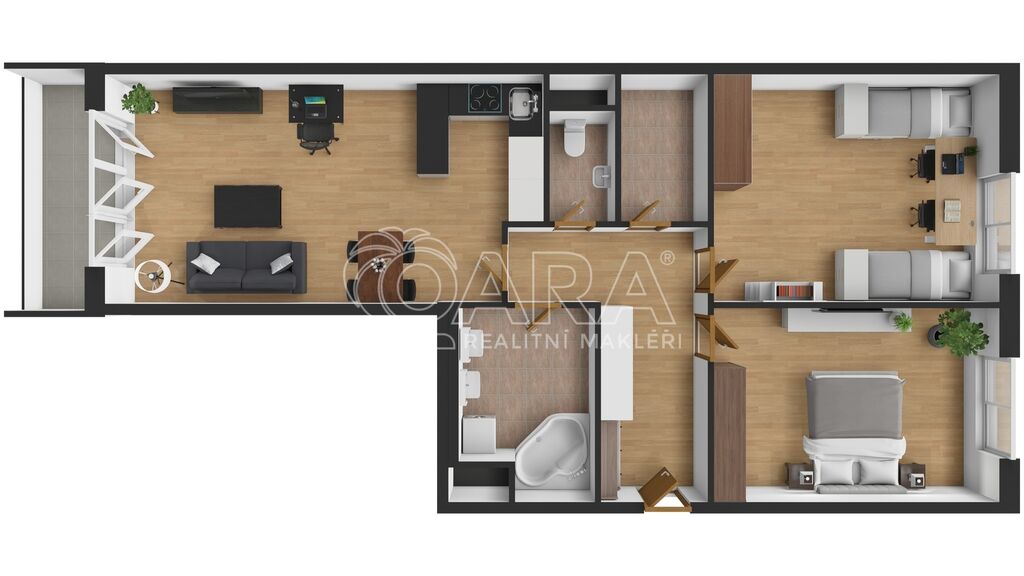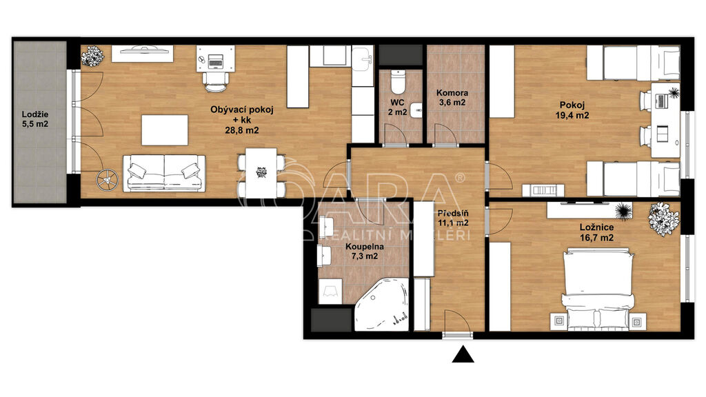 Byt je prakticky řešen: prostorná vstupní chodba, obývací pokoj propojený s kuchyní a vstupem na lodžii, dvě velké ložnice, komfortní koupelna s vanou, samostatné WC a komora.