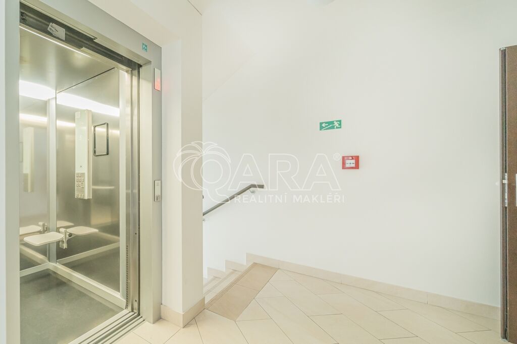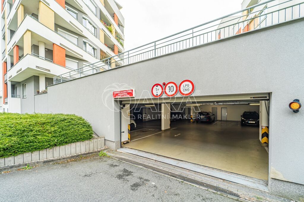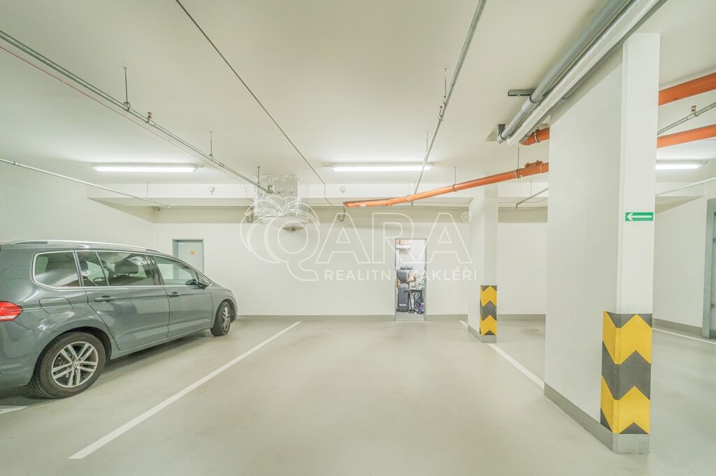 K bytu náleží nadstandardně velké parkovací místo (1,5 násobně širší) v podzemní garáži, které zajišťuje pohodlné parkování i pro velký vůz a přímo u něj je sklep 8,1 m².