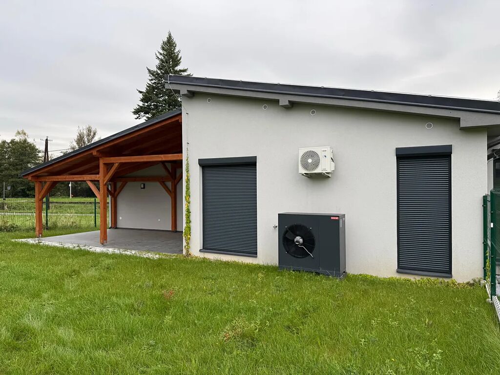 Vytápění – Tepelné čerpadlo, podlahové teplovodní v obývacím pokoji navíc klimatizační jednotka.