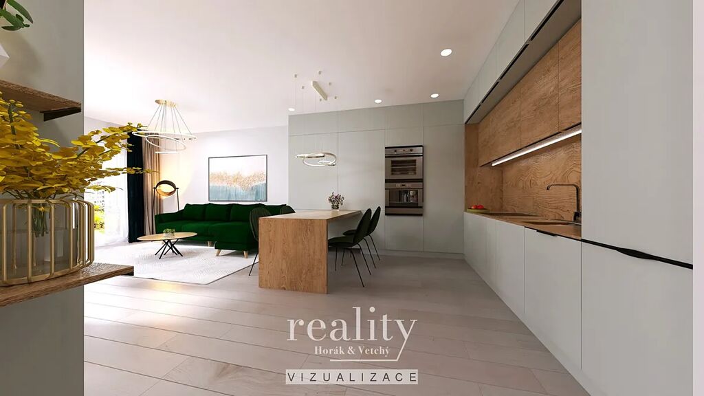 Byt je vybaven novou kuchyňskou linkou na míru s vestavnými spotřebiči. Na oknech jsou předokenní žaluzie.