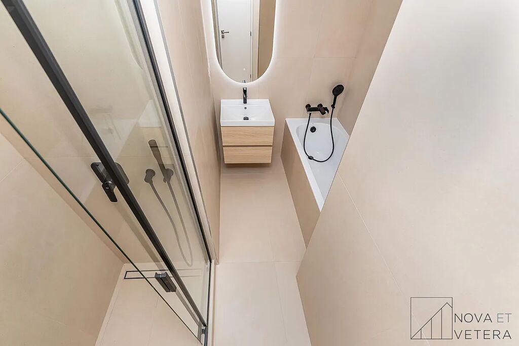 Byt právě prochází kompletní a kvalitní rekonstrukcí, která zahrnuje nové rozvody elektřiny, vody a odpadů, nové podlahy, moderní obklady a dlažbu značky Marazzi, koupelnu se sprchovým koutem, vanou, dvoj umyvadlem a sanitou Grohe a novou kuchyňskou linku se spotřebiči Gorenje s prodlouženou pětiletou zárukou.