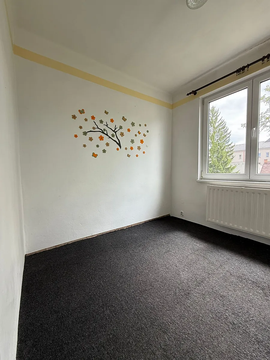 Dispozice bytu zahrnuje vstupní chodbu, prostorný obývací pokoj, ložnici, pokoj, kuchyň s jídelním koutem, koupelnu s vanou, samostatné WC a spíž.