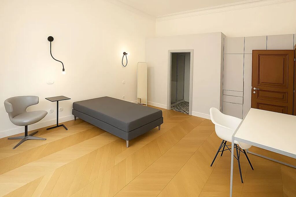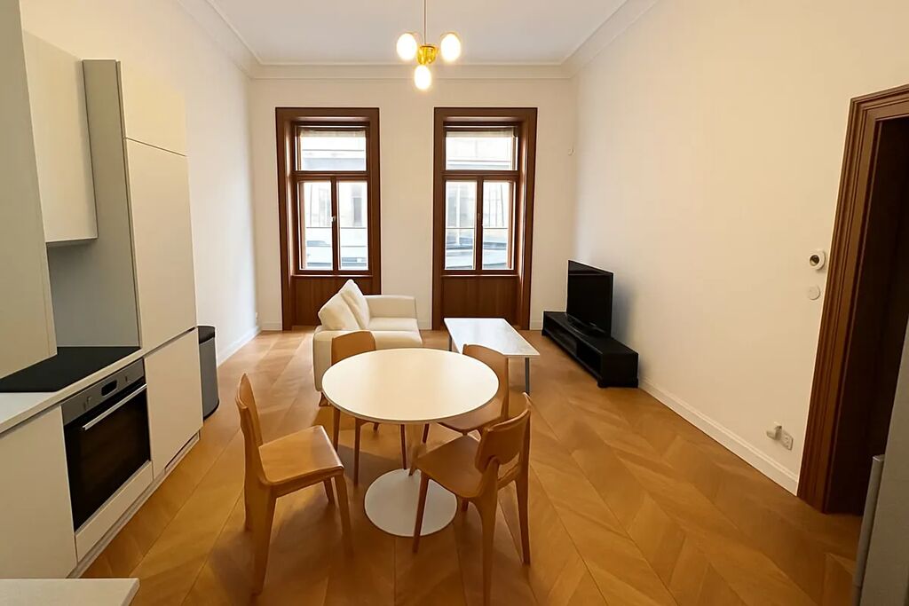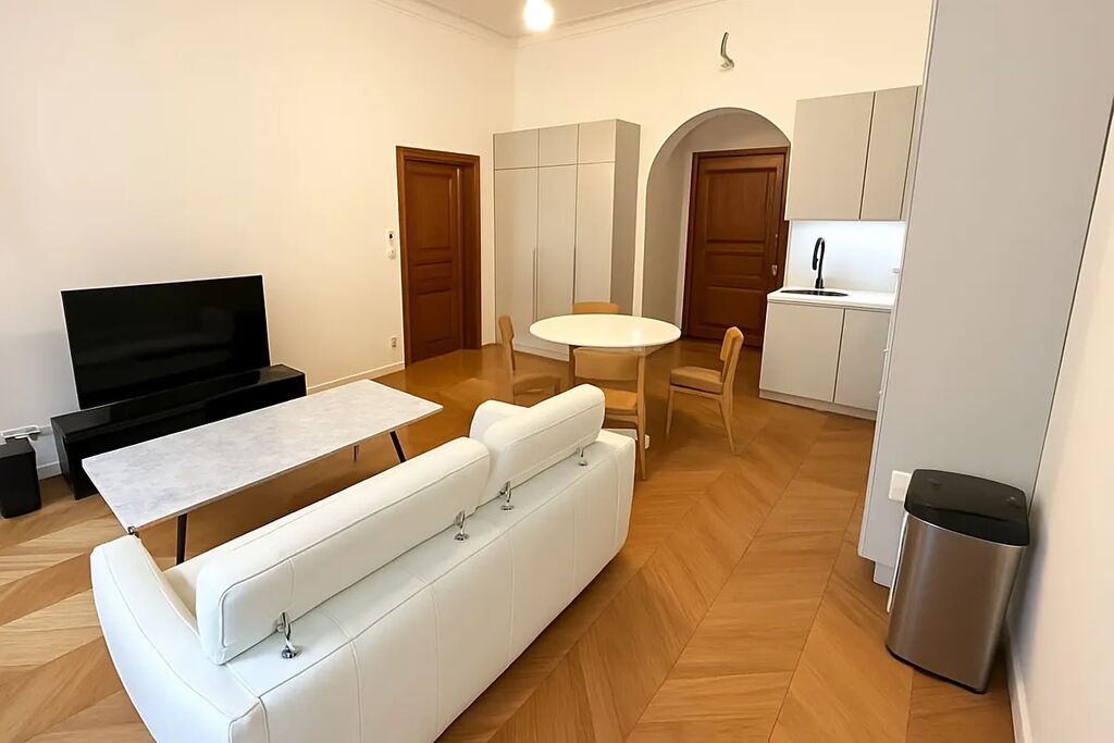 Byt je zařízený a nabízí plně vybavenou kuchyňskou linku, stylový mramorový konferenční stolek, pohovku, dvě pohodlná křesla, jídelní stůl se čtyřmi židlemi, prostorný pracovní stůl a postel.