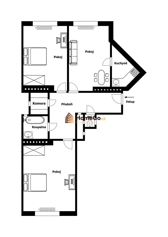 • obývací pokoj s kuchyní v odděleném prostoru (linka, varná deska, trouba, příprava na digestoř, místo na lednici)