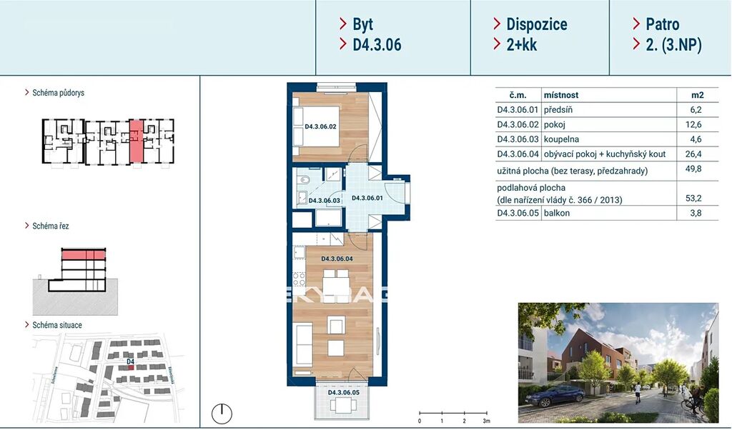 Dovolujeme si Vám nabídnout k prodeji byt 2+kk o výměře 53,2 m² s balkónem 3,8 m² v rezidenčním projektu Rezidence Čakovice.