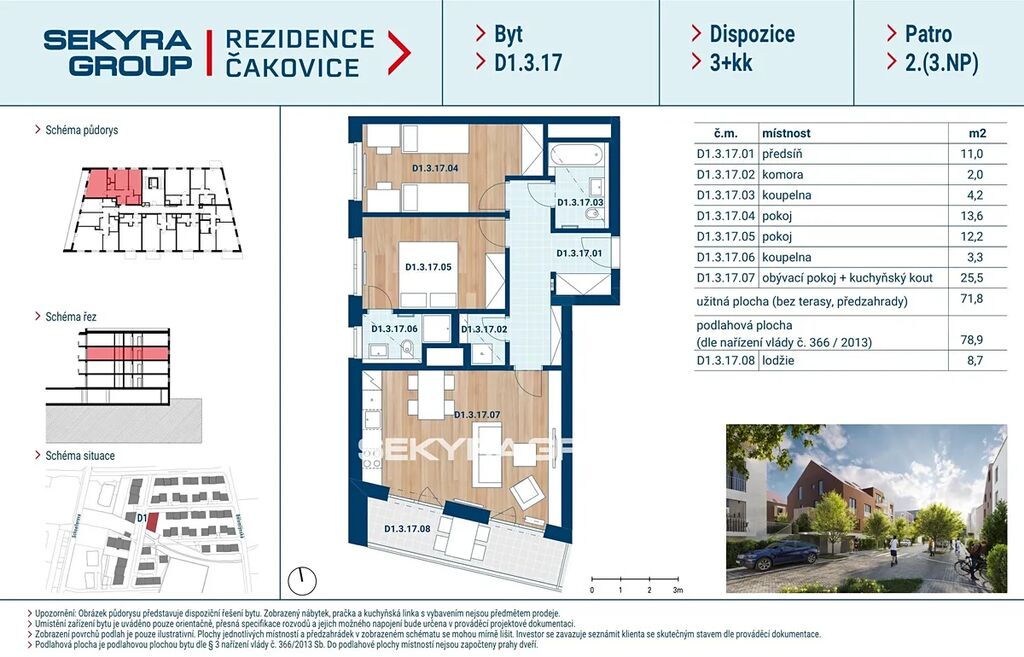 Dovolujeme si Vám nabídnout k prodeji byt 3+kk o výměře 78,9 m² s lodžií 8,7 m² v rezidenčním projektu Rezidence Čakovice.