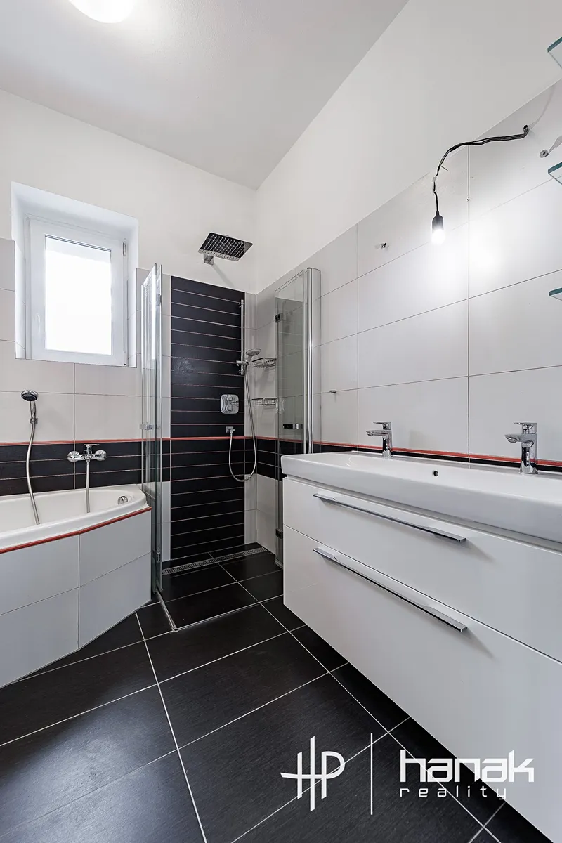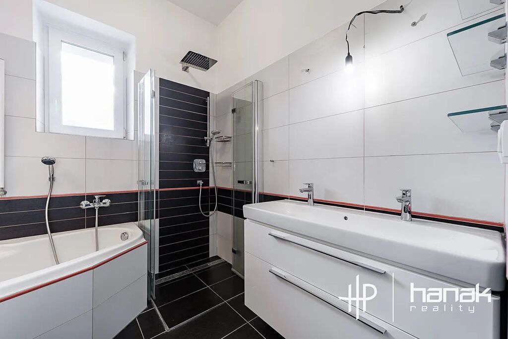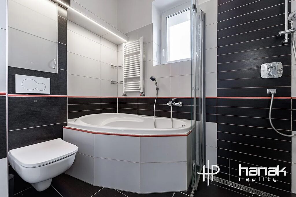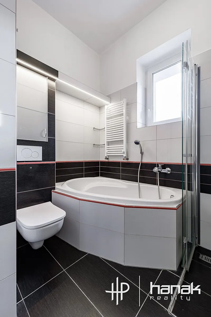 Dispozice bytu nabízí velkou vstupní chodbu s úložným prostorem, technickou místnost s místem pro pračku a sušičku, koupelna se sprchovým koutem, vanou a toaletou, oddělená toaleta.