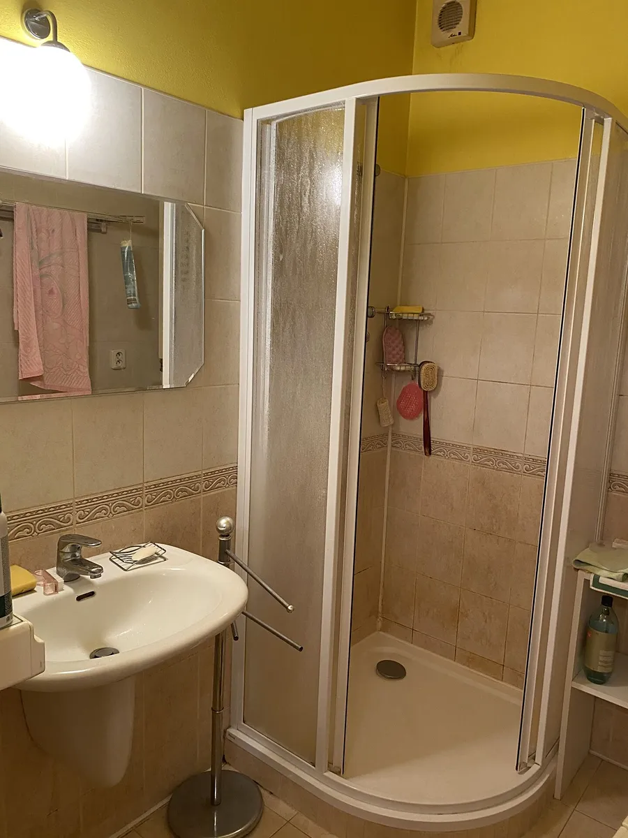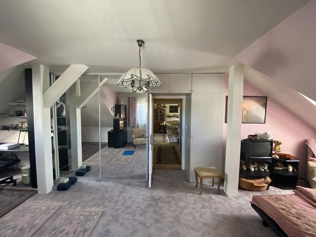 V podkroví byt 2+ kk s pracovnou, taktéž 85 m2. Tento byt lze příčkami rozdělit na 3+1. Koupelna s vířivou vanou a sprchou.