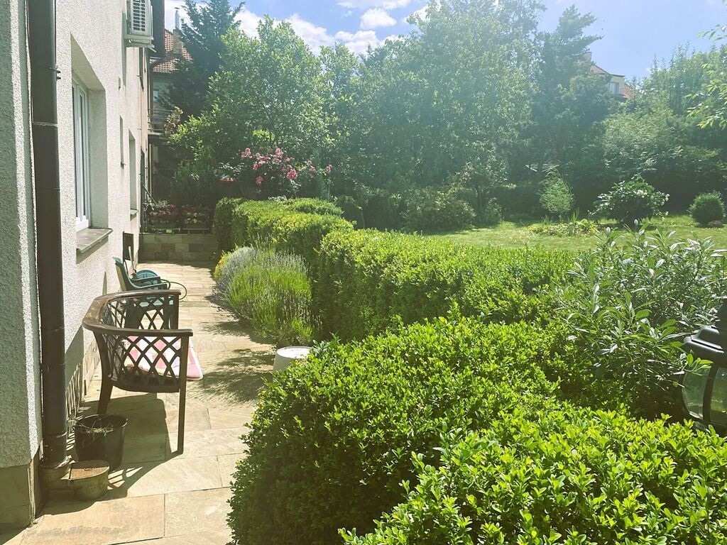 Krásná zahrada je orientována na jih. Je pravidelně udržována zahradníky. Zahrada je osvětlena a má zavedenou vodu na zalévání.