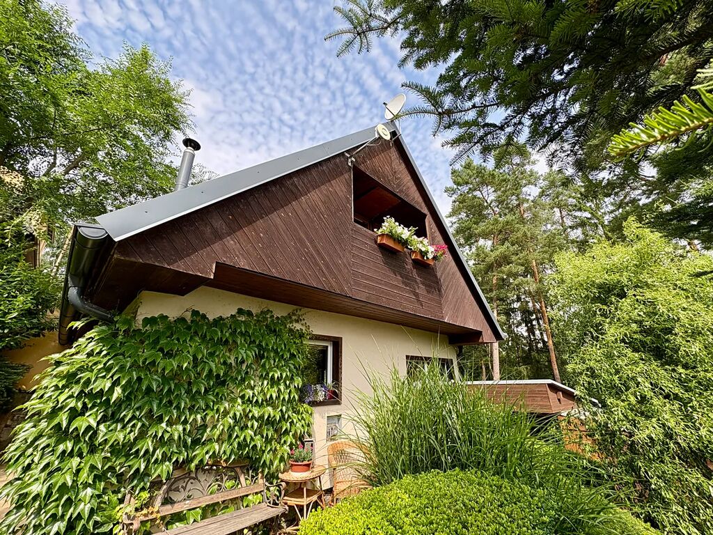 Nabízím k prodeji útulnou romantickou chatu k trvalému bydlení s krásnou zahradou v klidné části Mirošovic, 20 km od Prahy.