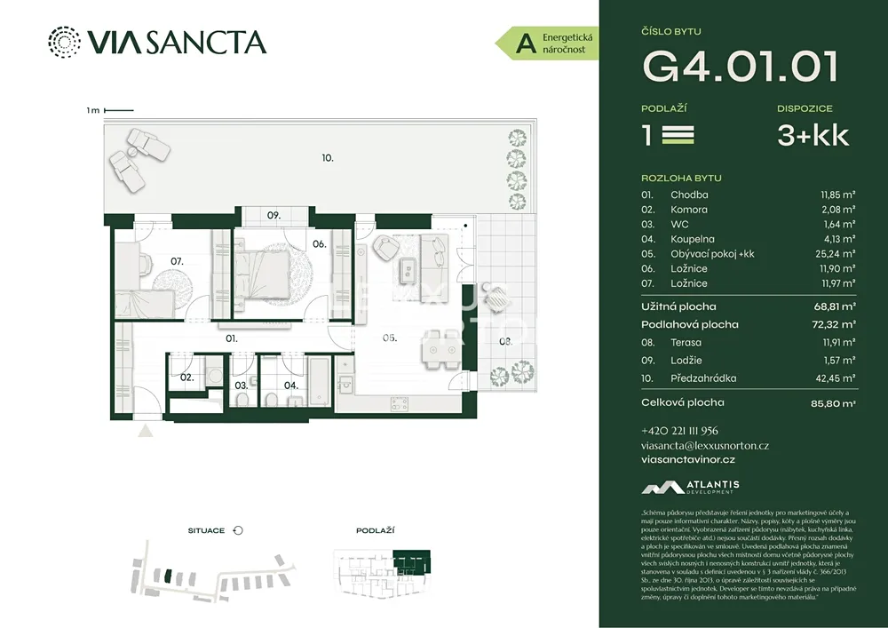 Hlavním benefitem tohoto bytu 3+kk o ploše 72,32 m² je kombinace prostorné terasy 11,91 m² a předzahrádky o velikosti 42,45 m², která poskytuje dostatek soukromí i prostoru k odpočinku. Obytný pokoj s kuchyňským koutem je přirozeným centrem bytu a umožňuje přímý vstup na terasu. Vstupní hala nabízí dostatek místa pro úložné prvky, komoru, koupelnu s vanou a samostatné WC. K bytu náleží sklepní kóje a možnost venkovního či garážového parkování.