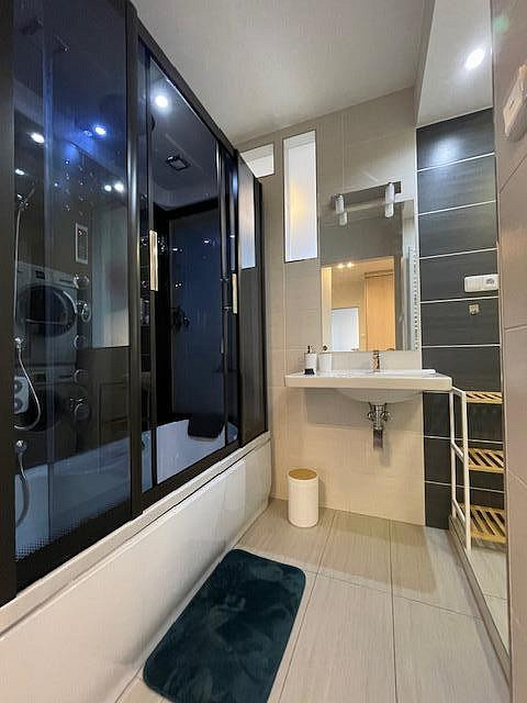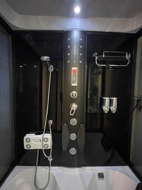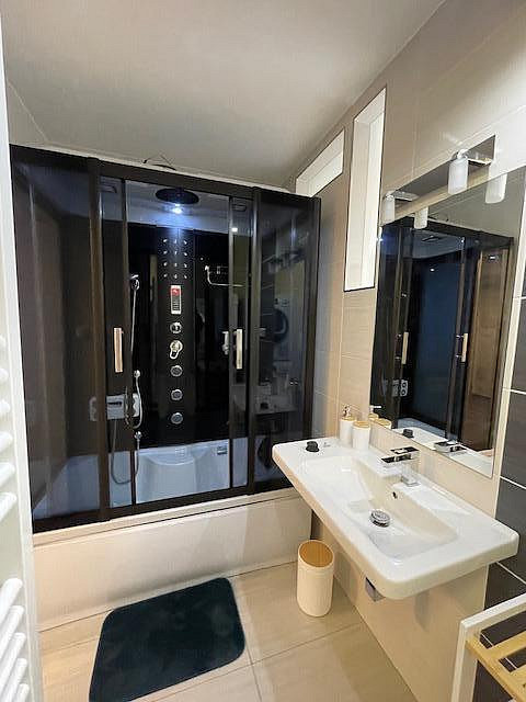 Koupelna nabízí komfortní, osvětlený sprchový kout s masážními tryskami a rádiem, což vytváří příjemné wellness zázemí. Samozřejmostí jsou okenní žaluzie, úložná kóje v mezipatře a vyhrazené parkovací místo.