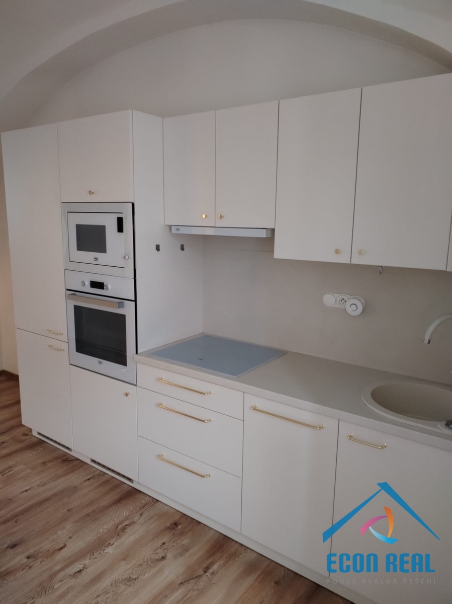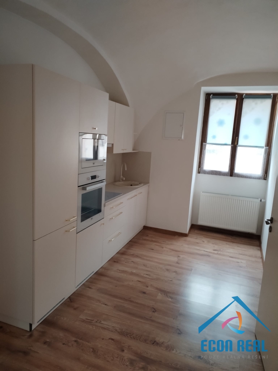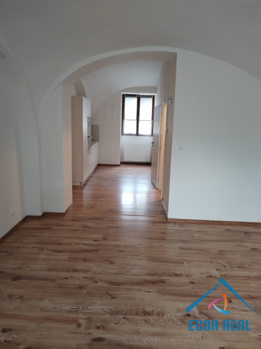 Byt s romantickými obloukovými klenbami a kuchyňskou linkou vybavenou spotřebiči se nachází v historické budově s přístupem přes prostorný dvůr domu s možností parkování 1 vozidla. Byt disponuje předsíňkou, ve které je umístěno i technické zázemí (elektrický kotel a bojler na ohřev vody) a hlavní část je opticky stavebním otvorem rozdělena na zadní pokoj a přední část s moderní kuchyňskou linku se sklokeramickou deskou, elektrickou troubou, lednicí s mrazákem a myčkou. Koupelna nabídne prosklený sprchový kout, umyvadlo se skříňkou a zrcadlem, toaletu a přípojku na pračku. Byt má velká okna směřující do dvora a do zahrady. Topení řešeno elektrokotlem, ohřev teplé vody pomocí velkokapacitního bojleru. Byt se pronajímá nevybavený (pouze uvedené zařízení). Interiér si zařizuje nájemce sám. Na podlaze plovoucí podlahy a dlažby. Byt je prostorný, velmi světlý, tichý a dobře řešený.