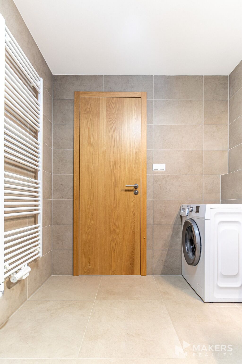 Koupelna je moderní, prostorná a působí čistě díky světlým obkladům. Je vybavena sprchovým koutem, umyvadlem s úložným prostorem, toaletou, bidetem i pračkou.